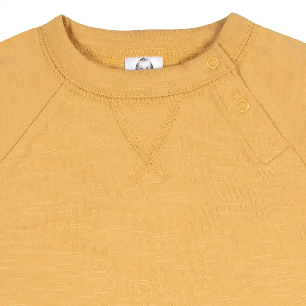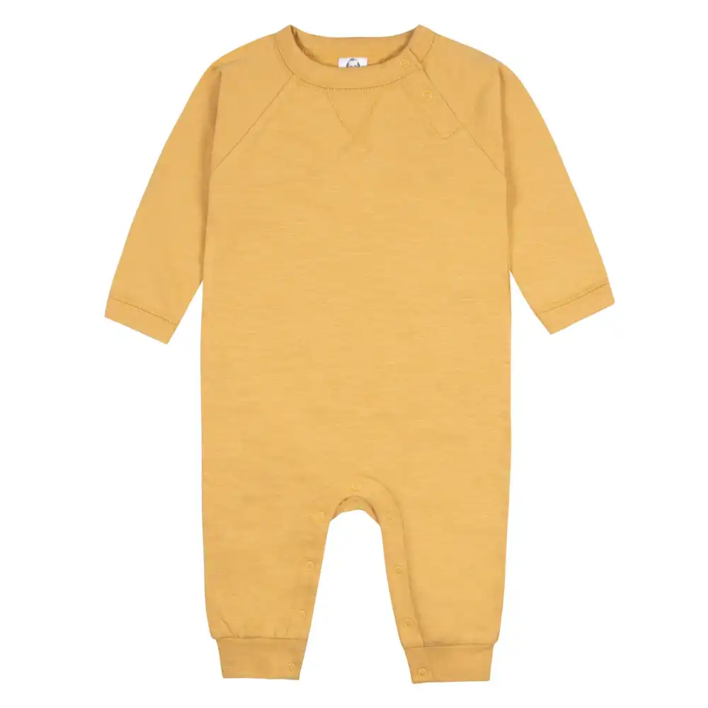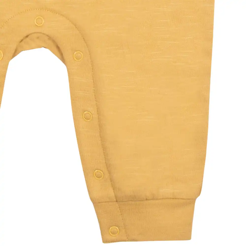 Your little one will adore our soft long sleeve rompers! Each one is made with 100% cotton french terry. We had our essentials independently certified with STANDARD 100 by OEKO-TEX® so that you don’t have to worry about harmful substances in your baby’s wardrobe. This pack includes two baby boy gray camo and solid yellow rompers.
