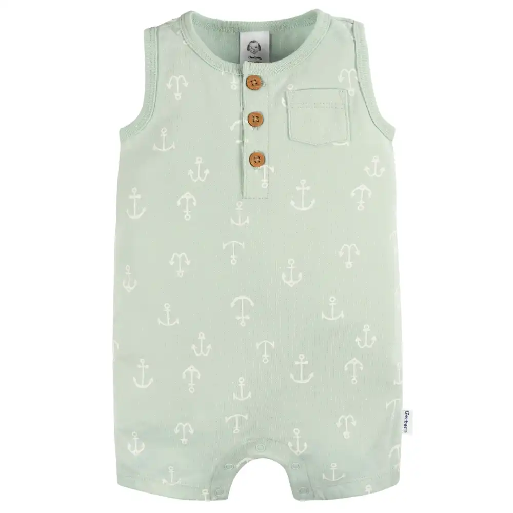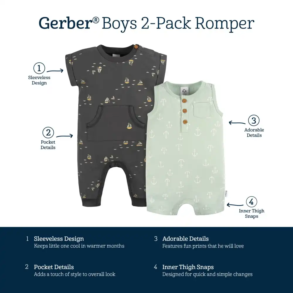 Elevate your baby boy's summer wardrobe with our two-pack of rompers, designed for all his sunny day adventures. Crafted from 100% cotton, these rompers are exceptionally soft with a slight stretch to the material, providing a comfortable all-day fit for your little one during those warm, sunny days. The gentle fabric is perfect for sensitive skin, and easy to clean with machine washing. These summer baby rompers get your little one’s closet ready for warmer months! Our essentials have been independently certified with STANDARD 100 by OEKO-TEX® so that you don’t have to worry about harmful substances in your baby’s wardrobe. Includes two rompers.
