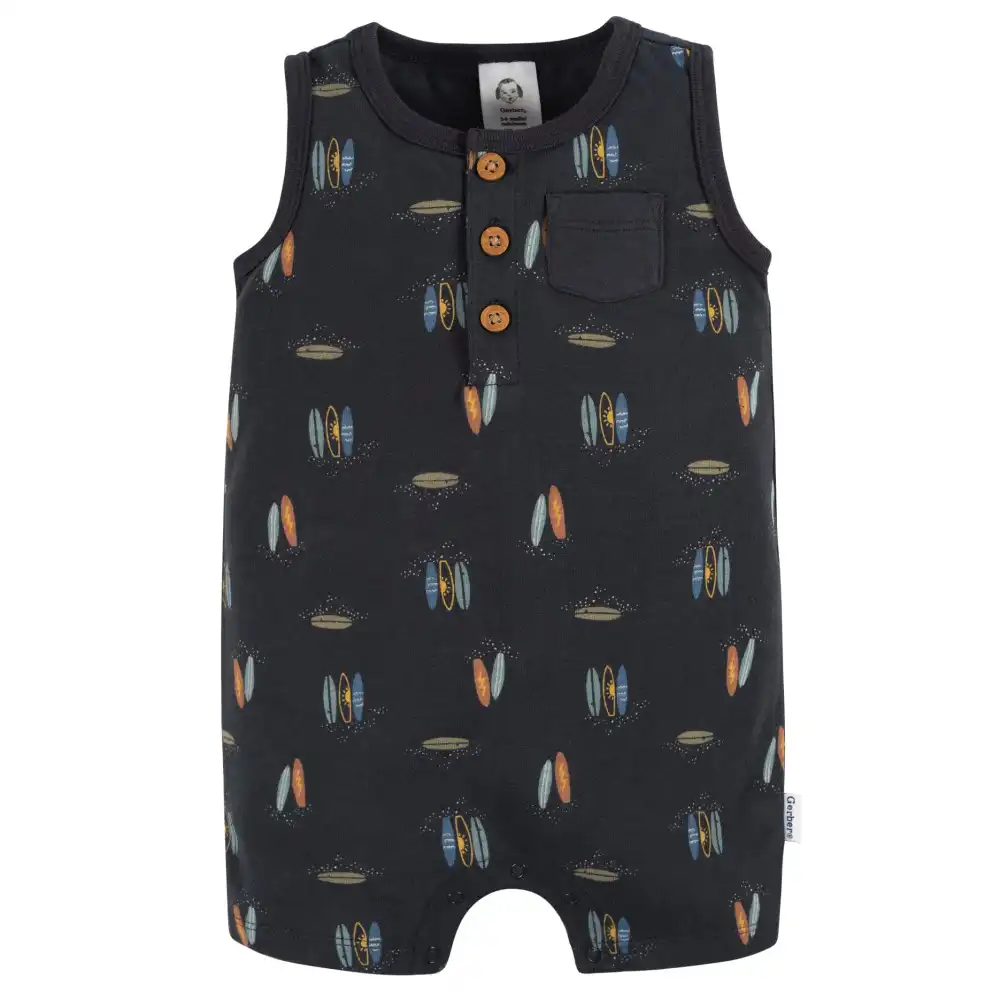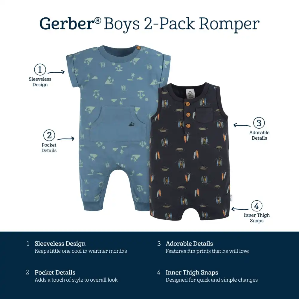 Embrace sunny days with these rompers, crafted to handle all the warm weather adventures that await your baby boy! Crafted from 100% cotton peached jersey, they provide a gentle feel against delicate skin, while the slightly stretchy fabric ensures a comfortable all-day fit. Equipped with snaps at the legs, these rompers simplify diaper changes, leaving more time for fun adventures. And when it comes to cleaning, you can conveniently pop them in the washing machine, ensuring they're fresh and ready for the next outing. With this set of two baby boy rompers, you'll be well-prepared to kickstart your little one's summer wardrobe. Our essentials have been independently certified with STANDARD 100 by OEKO-TEX® so that you don’t have to worry about harmful substances in your baby’s wardrobe. Includes two rompers.