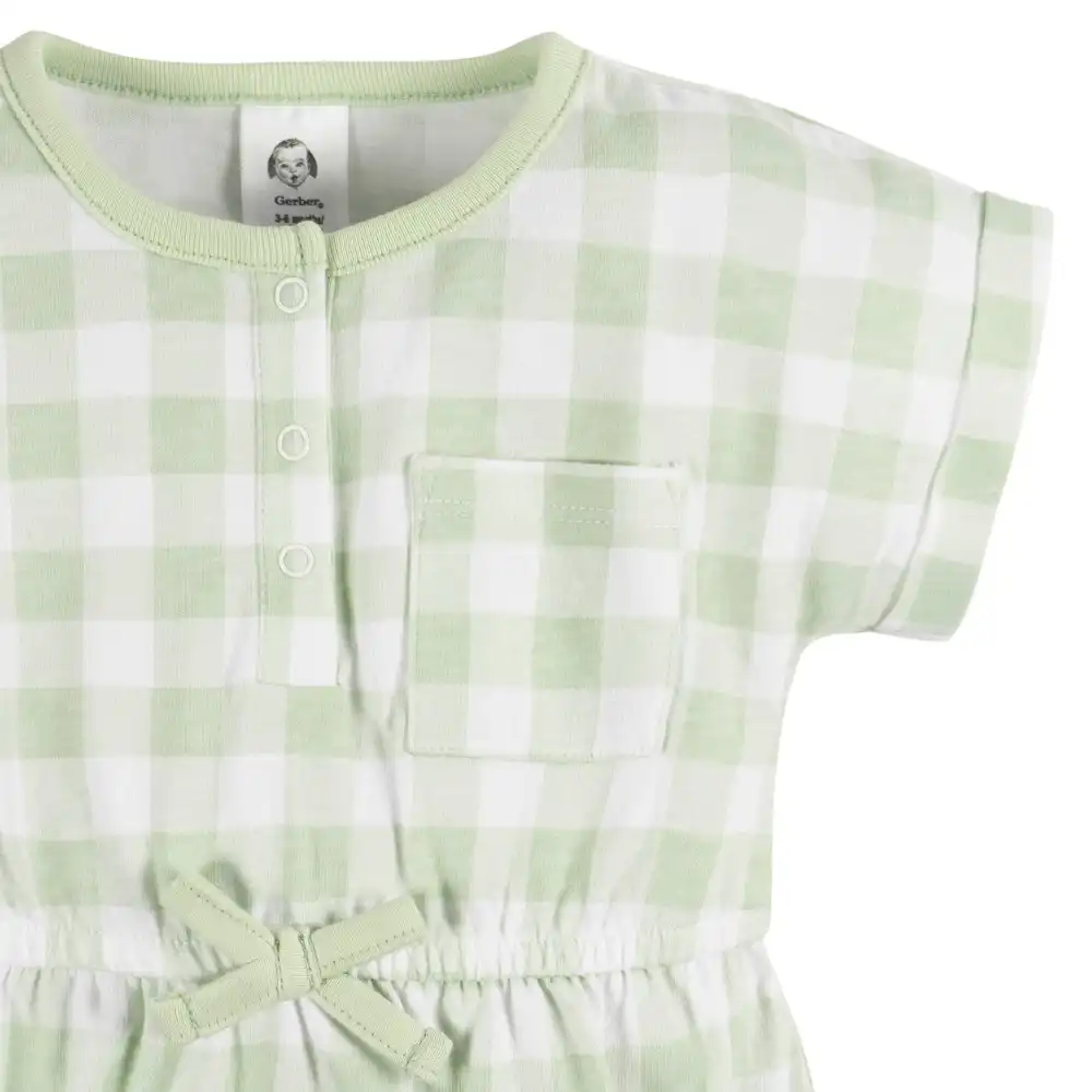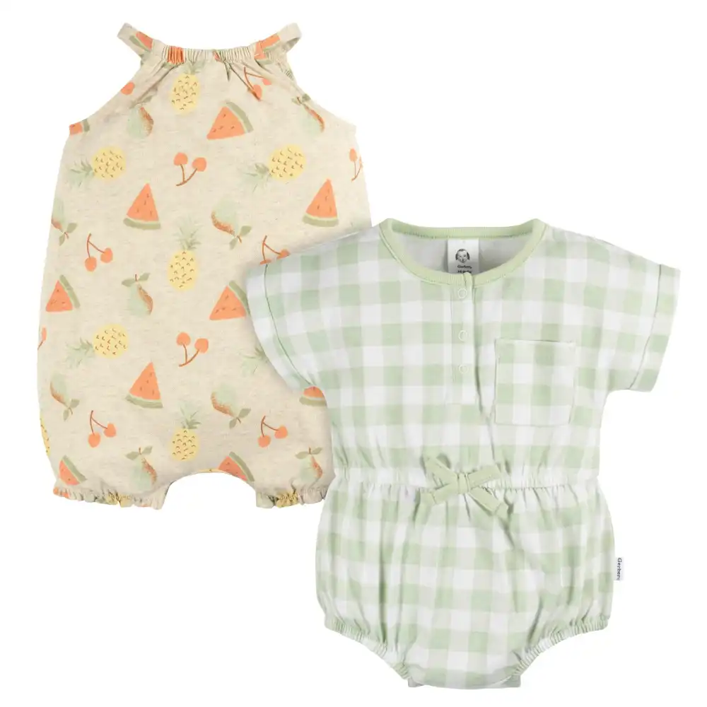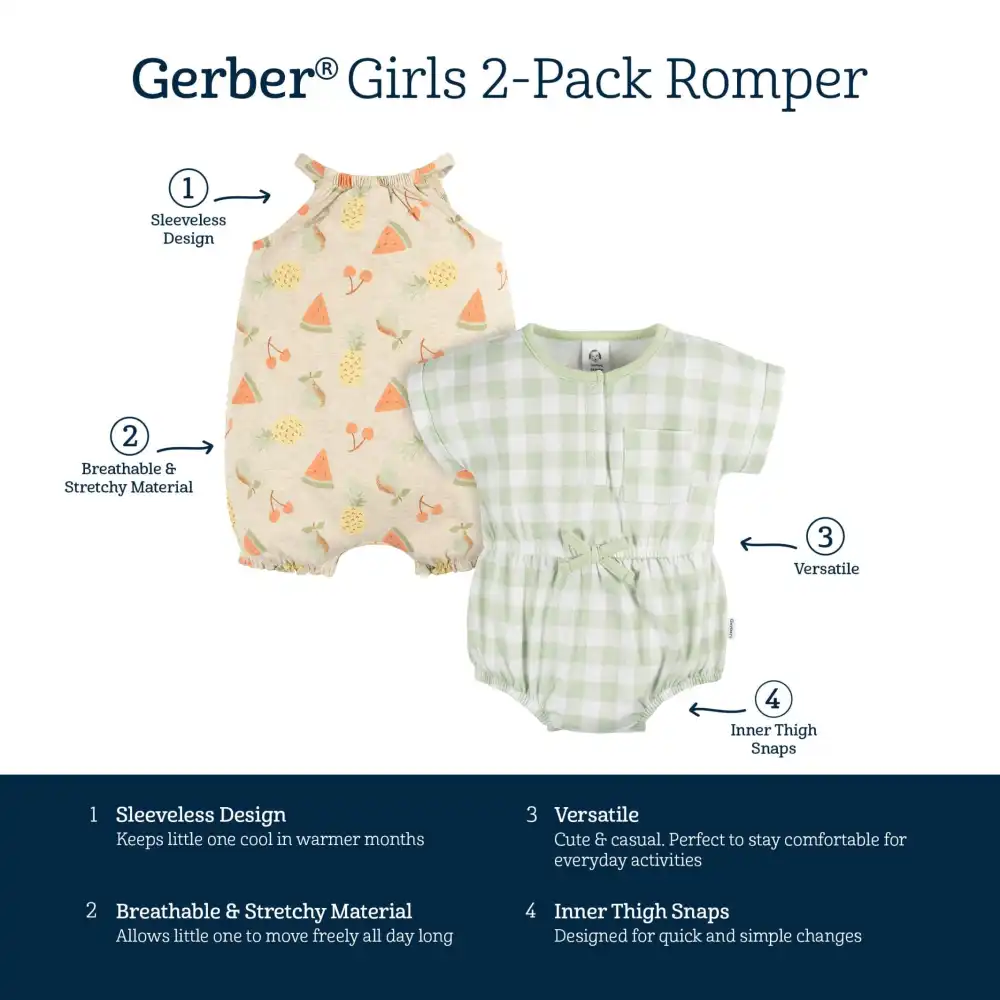 Our two-pack of baby girl rompers are the perfect choice for sunny days! Crafted from 100% cotton to ensure a soft and gentle touch on your baby's sensitive skin, the slightly stretchy material provides an all-day comfortable fit, allowing your little one to move and play freely. With convenient leg snaps, dressing and diaper changes become simple, and when it's time for cleaning, these rompers are machine washable for your convenience. Our essentials have been independently certified with STANDARD 100 by OEKO-TEX® so that you don’t have to worry about harmful substances in your baby’s wardrobe. Includes two rompers.