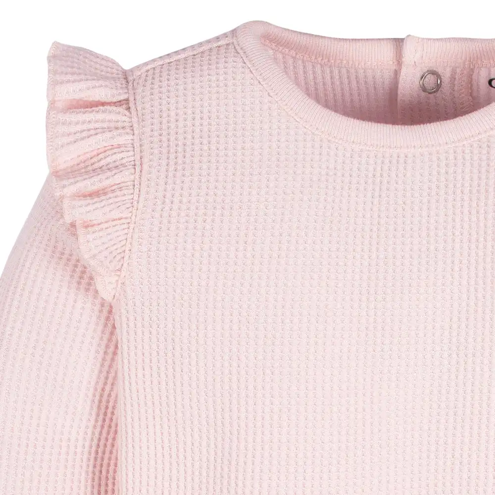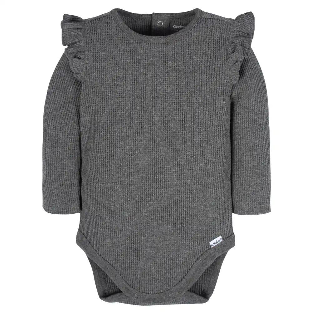 The Onesies® Brand Bodysuit is a wardrobe essential. Easy to use as a one-piece or layer on chilly days, this bodysuit is made from a super soft fabric blend with strategic ribbing at the neck and legs for added comfort. Long sleeves keep your baby girl will be cozy and warm even when the weather turns cooler. Simple to pullover and secure with leg snaps, shoulder ruffles add an adorable touch to this fast fit. Our essentials have been independently certified with STANDARD 100 by OEKO-TEX® so that you don’t have to worry about harmful substances in your baby’s wardrobe. This pack includes one solid pink and one solid heather grey Onesies® Brand Bodysuit.