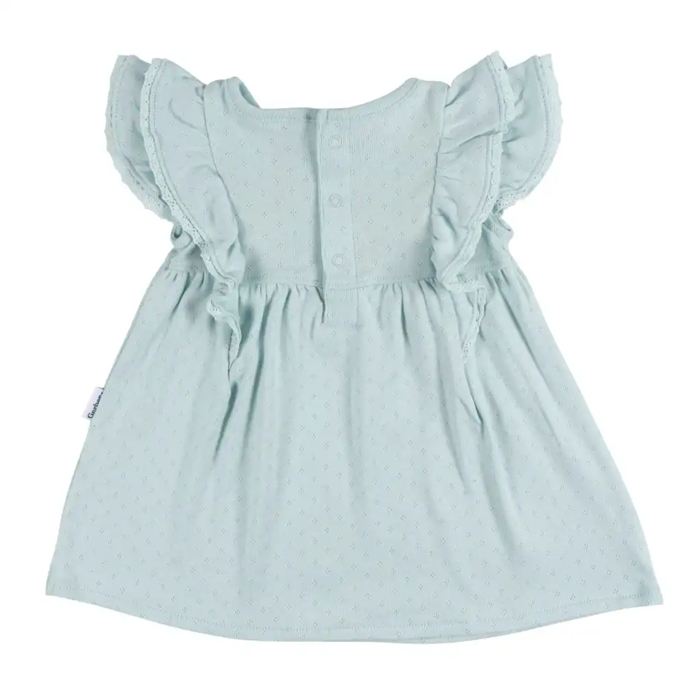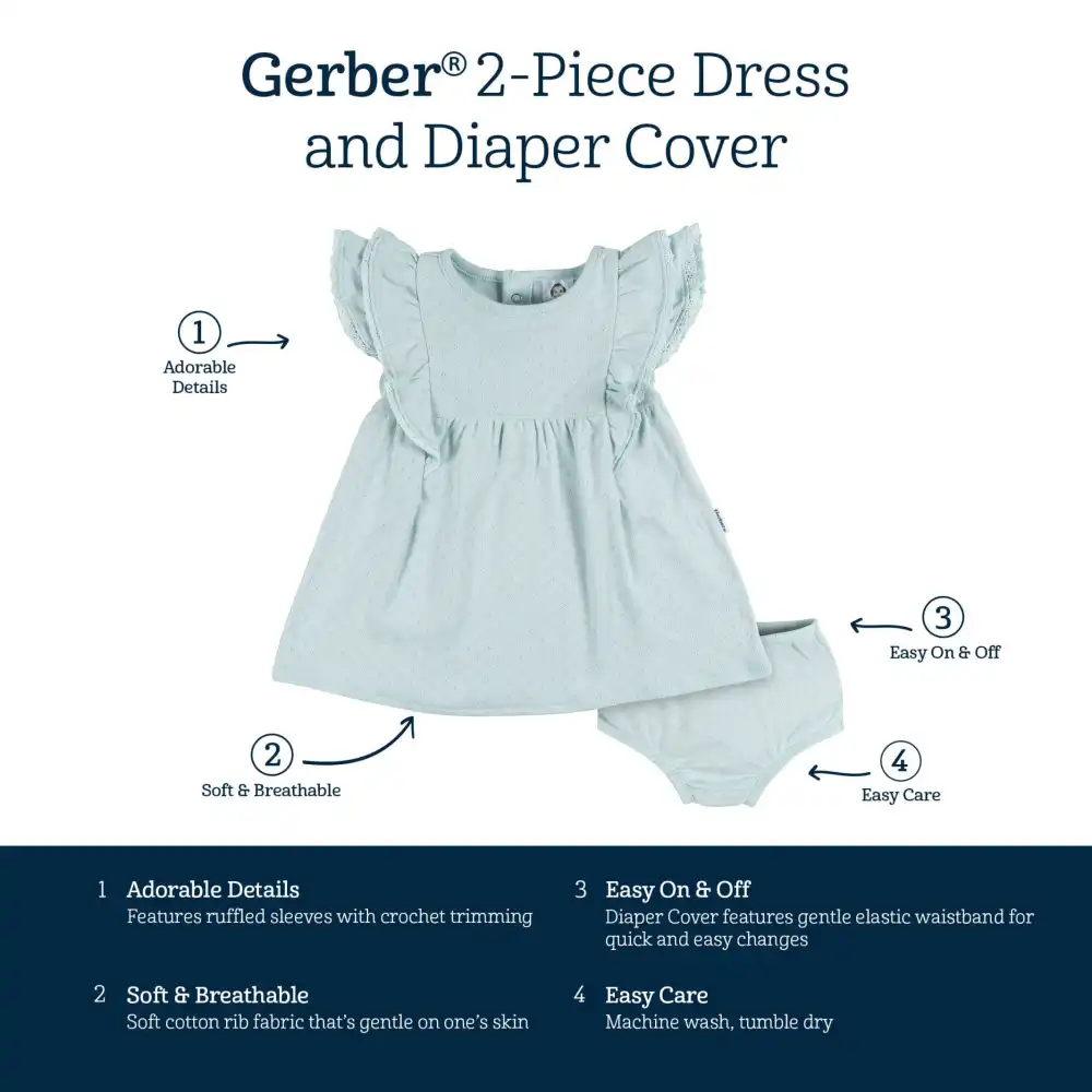 Prepare your baby girl for a day of sun and smiles with our matching dress and diaper cover set. Crafted with care, this outfit provides a gentle touch on sensitive skin. Its soft and airy fit makes it perfect for warm, sunny days, keeping her comfortable and cool. Dressing is easy with the simple pull-on style and rear snaps, while the diaper cover can be easily removed for a quick change. The elegant shoulder ruffles add a touch of charm to her look, while the convenience of being machine washable keeps your life simple. Dress for sunshine wherever you go with this adorable set! Our essentials have been independently certified with STANDARD 100 by OEKO-TEX® so that you don’t have to worry about harmful substances in your baby’s wardrobe. Includes one dress and diaper cover.