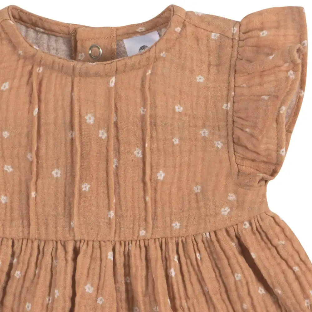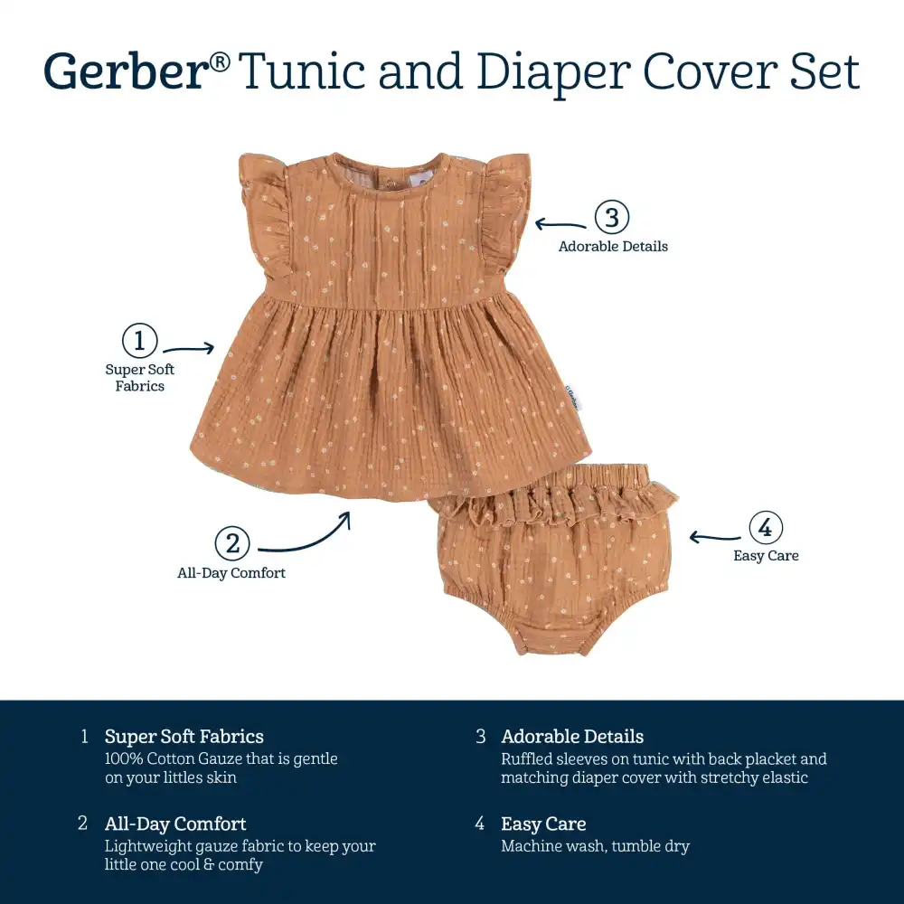 Your baby girl needs a comfortable and cute warm-weather outfit, and our baby girl tunic and diaper cover is the perfect choice. Made from 100% cotton double layer gauze, it's gentle on her sensitive skin, providing both comfort and breathability. This delightful set is perfect for those sunny days when she wants to explore in style. Our essentials have been independently certified with STANDARD 100 by OEKO-TEX® so that you don’t have to worry about harmful substances in your baby’s wardrobe. Includes one tunic with matching diaper cover.