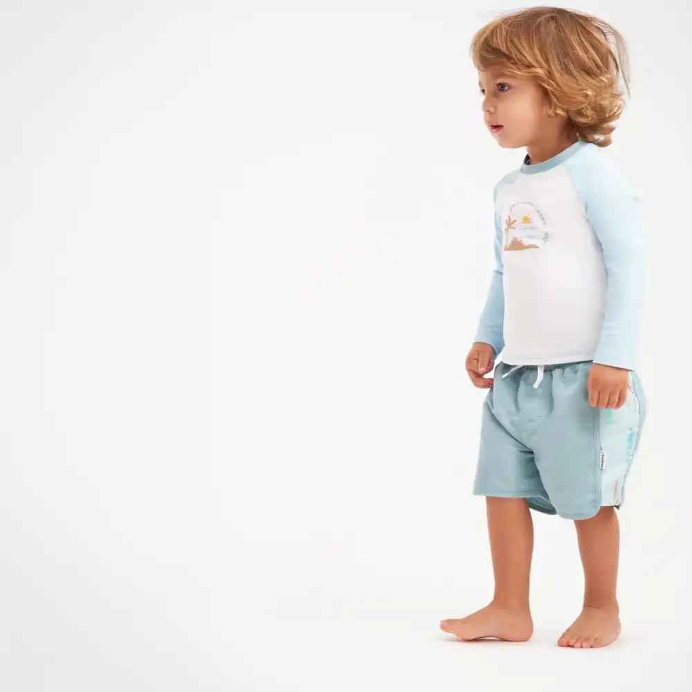 This two-piece rash guard and swim trunks set for baby boys and toddler boys offers the perfect solution for an enjoyable day of water-fun activities. Whether you're by the seaside, at the pool, or simply enjoying the sprinklers, this quick-drying fabric boasts UPF 50+ to shield against harmful sun rays. The coordinated top and bottom ensure you have everything required for a day of secure, safe, and stylish fun! Our essentials have been independently certified with STANDARD 100 by OEKO-TEX® so that you don’t have to worry about harmful substances in your baby’s wardrobe. Includes a two-piece rash guard and swim trunks set.