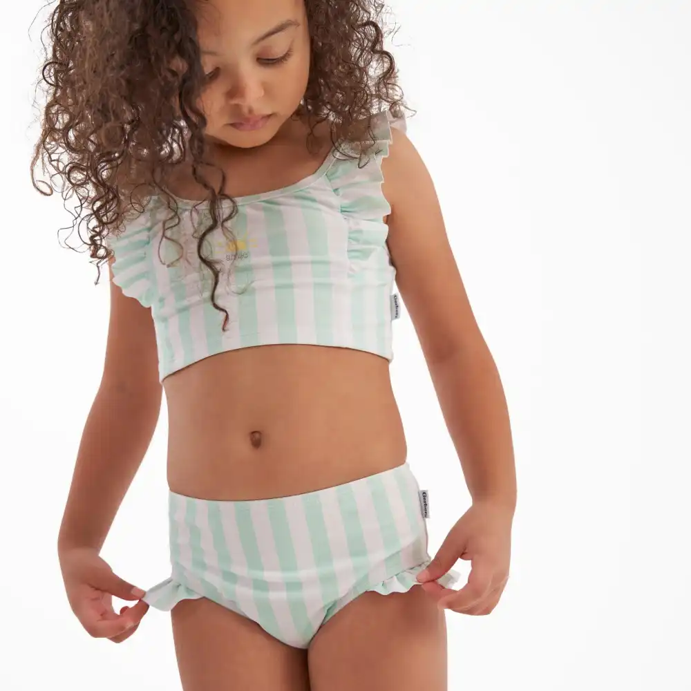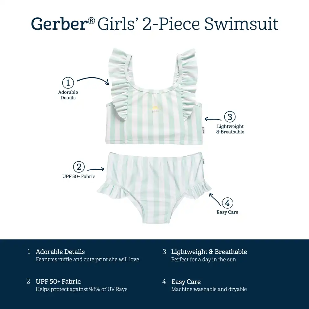 Get ready to make a splash at the beach or pool with this charming toddler girl's swimsuit ensemble! With its timeless stripes and delightful shoulder and leg ruffles, your little one is sure to be enchanted by this swimsuit. This classic look swimsuit features UPF 50+ protective fabric to shield against harmful sun rays. It's the perfect blend of timeless fashion and practical sun protection for your little one! Our essentials have been independently certified with STANDARD 100 by OEKO-TEX® so that you don’t have to worry about harmful substances in your baby’s wardrobe. This pack includes two-piece swimsuit set.