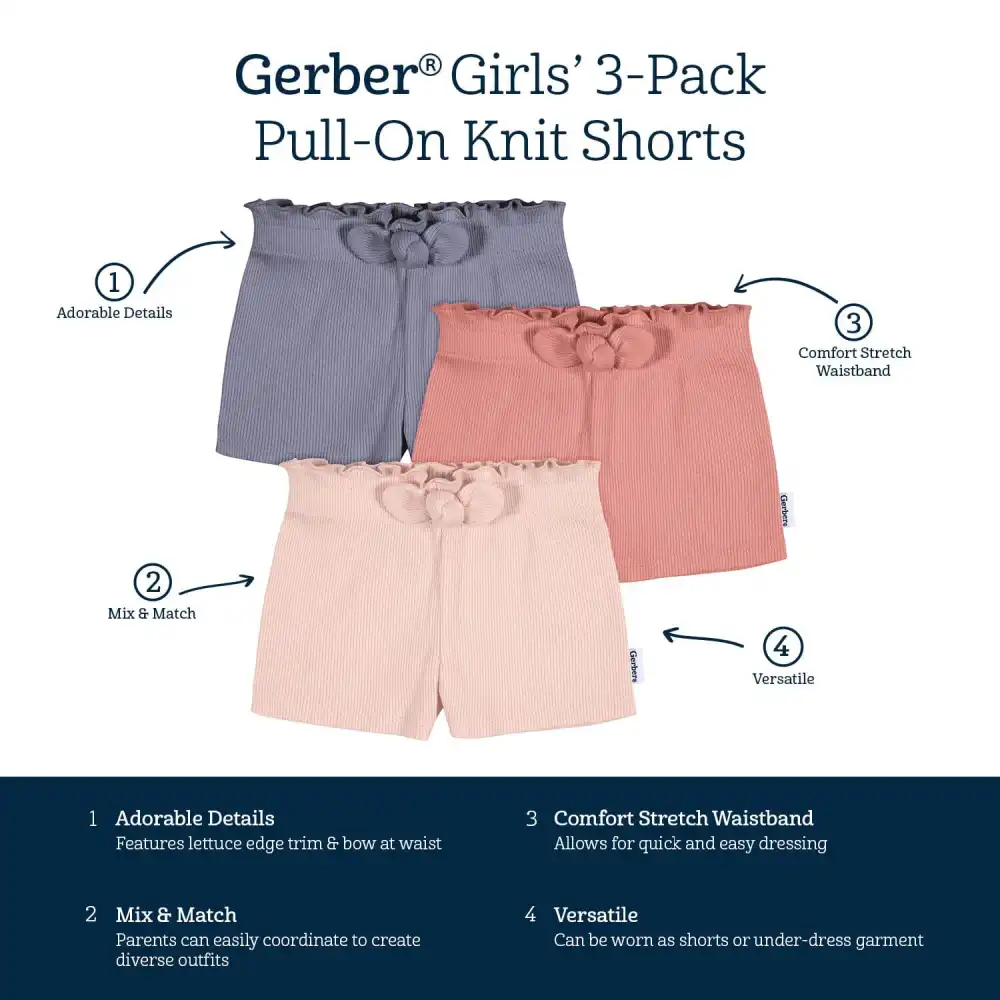 • 3-Pack Baby & Toddler Girls Blue & Pinks Pull-On Knit Shorts