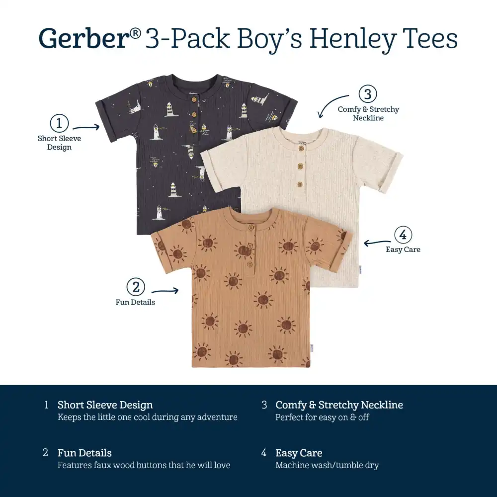 Prepare for the sun-filled days ahead with our set of three short-sleeve Henley T-shirts for baby boys and toddler boys. Crafted from a blend of gentle cotton and spandex, these shirts offer a comfy stretch. They provide a cool and breathable feel that's just right for warm weather, ensuring your little one will be content wearing them on any adventure. To simplify cleaning, our T-shirts are machine-washable, ensuring they stay ready for him to wear again and again. Our essentials have been independently certified with STANDARD 100 by OEKO-TEX® so that you don’t have to worry about harmful substances in your little one’s wardrobe. Includes three T-shirts.