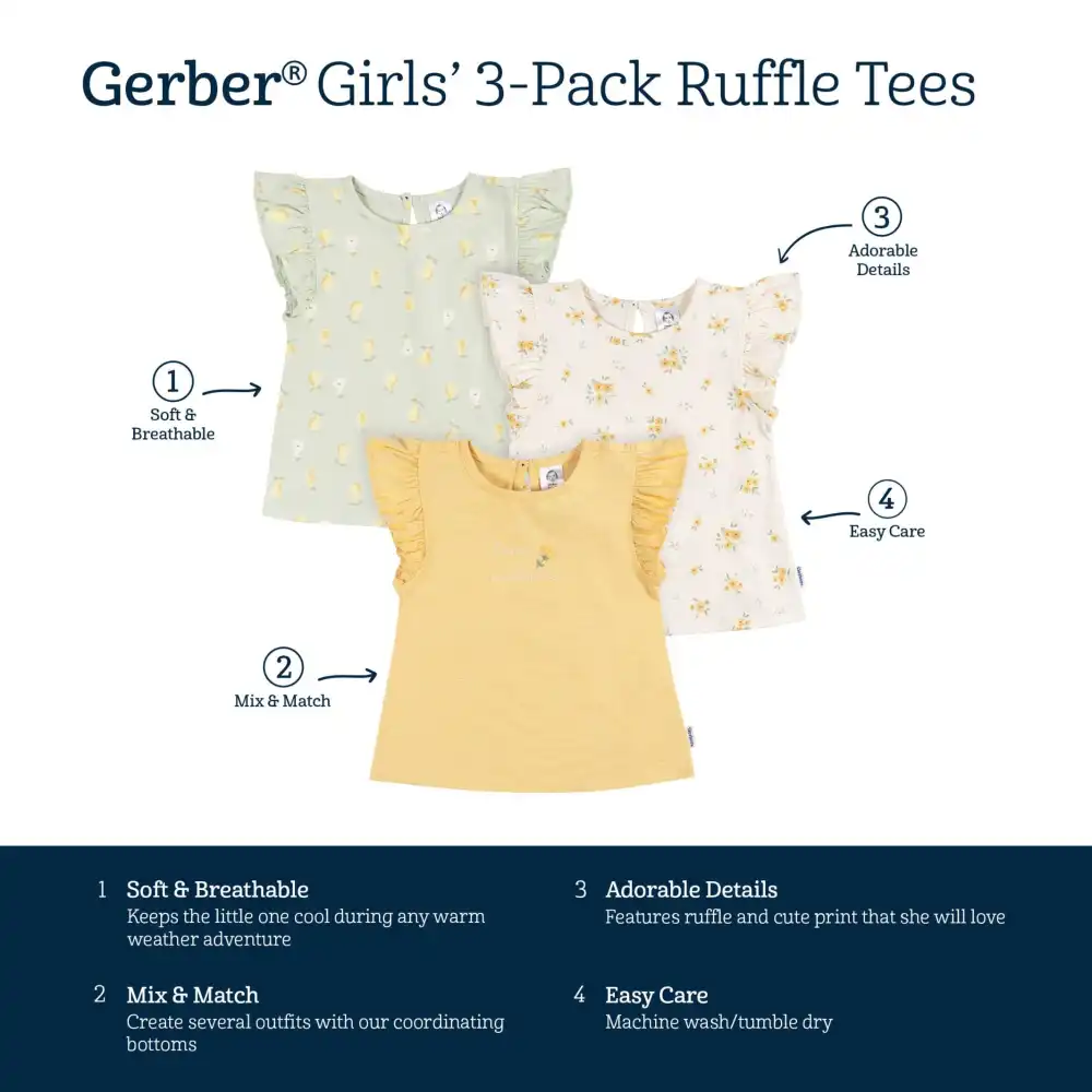 Embrace the sunshine with a wardrobe refresh! This set of three T-shirts for baby girls or toddler girls elevates their warm-weather style. Crafted from 100% cotton, the shirts are gentle on delicate skin and offer a breathable fit. With an assortment of prints and colors in the bundle, it's effortless to create coordinated outfits that your little one will enjoy wearing wherever the day takes you. The addition of shoulder ruffles adds a trendy flair to this comfortable daily choice. For stress-free care, these T-shirts are all machine washable so can have them clean and ready to wear all season long. Our essentials have been independently certified with STANDARD 100 by OEKO-TEX® so that you don’t have to worry about harmful substances in your little one’s wardrobe. Includes three T-shirts.