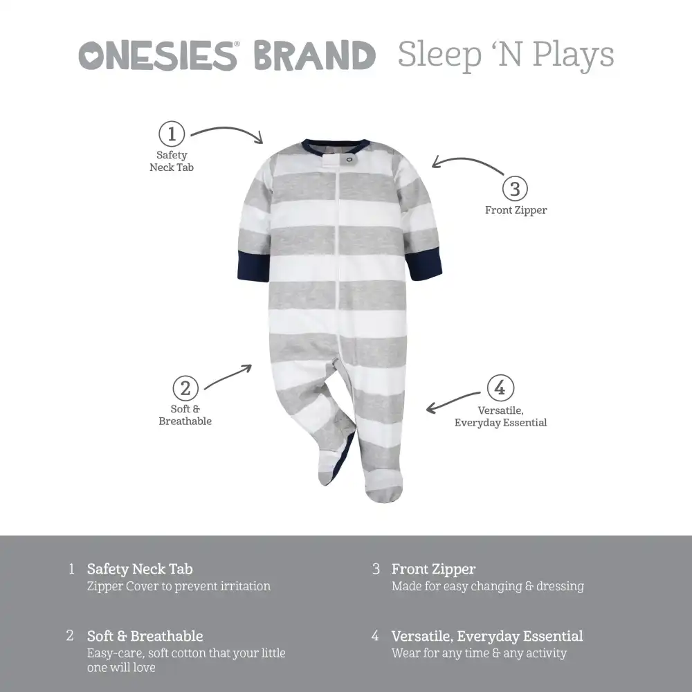 Do yourself (and baby!) a favor and stock up on Sleep ‘n Plays! These Onesies® Brand Sleep ‘n Plays are the perfect baby boy outfits for day and night. Each baby sleeper is made with soft and breathable cotton. Use these outfits as baby pajamas or as comfy loungewear. Each one features a zipper down the front for easy changes with a safety tab to prevent the zipper from poking and irritating baby’s chin. Layer underneath them with Onesies® Brand bodysuits when it’s cold. The handsome designs and prints make these baby clothes a great gift, especially for new parents! These Sleep ‘n Plays are machine washable and machine dryable. This pack includes four Onesies® Brand Sleep 'n Plays.