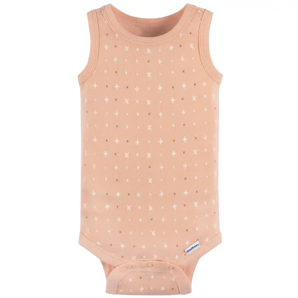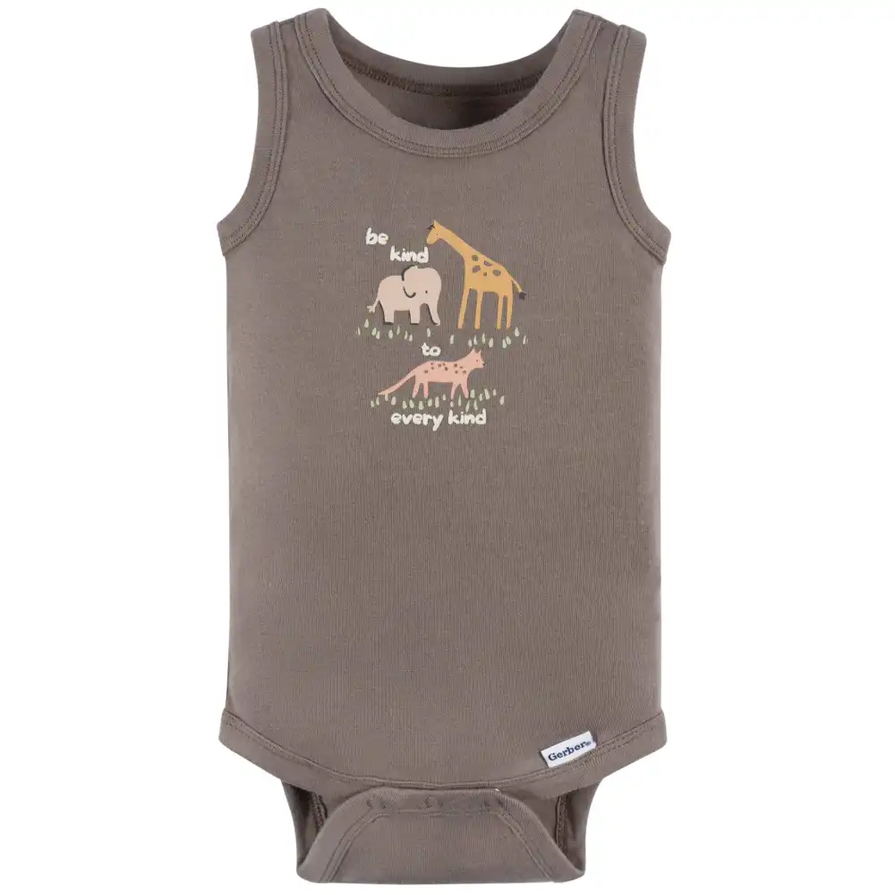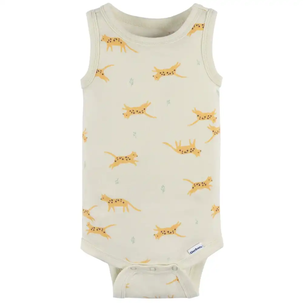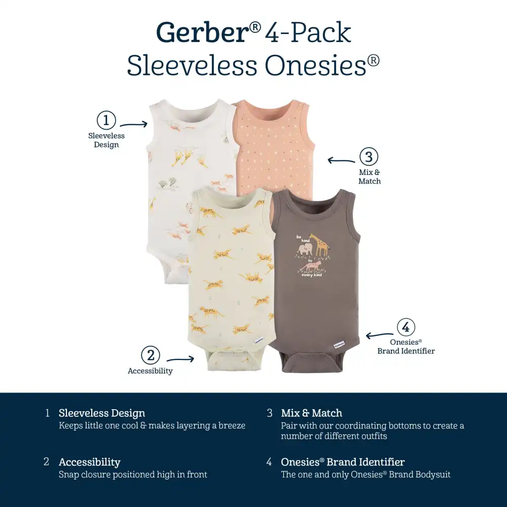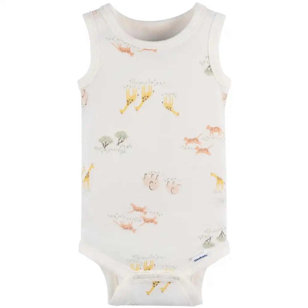 Introduce your little one to the wonders of the wild with our charming 4-pack of gender-neutral sleeveless baby bodysuits! Crafted primarily from soft cotton with a touch of spandex, these bodysuits offer just the right amount of stretch for a comfortable fit that moves with your baby. The sleeveless design is perfect for sunny day fun, and the convenient leg snaps make dressing and diaper changes easy. With comfort-stretch material at the neck, arms, and legs, your little explorer will enjoy all-day comfort. Featuring a delightful color scheme of white, green, brown, and yellow, these bodysuits showcase playful safari-themed prints of giraffes, elephants, and cheetahs, making them an adorable addition to any baby’s wardrobe! Our essentials have been independently certified with STANDARD 100 by OEKO-TEX® so that you don’t have to worry about harmful substances in your baby’s wardrobe. Pack includes four Onesies® bodysuits.
