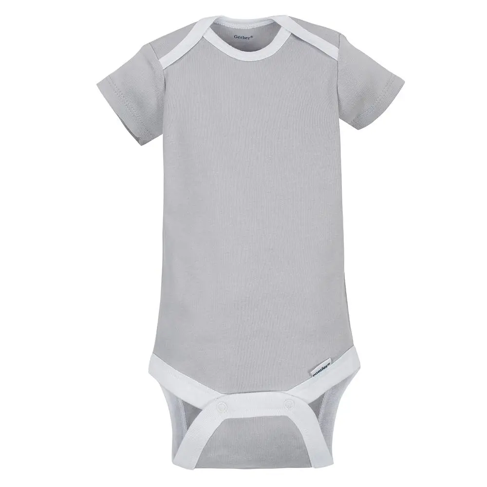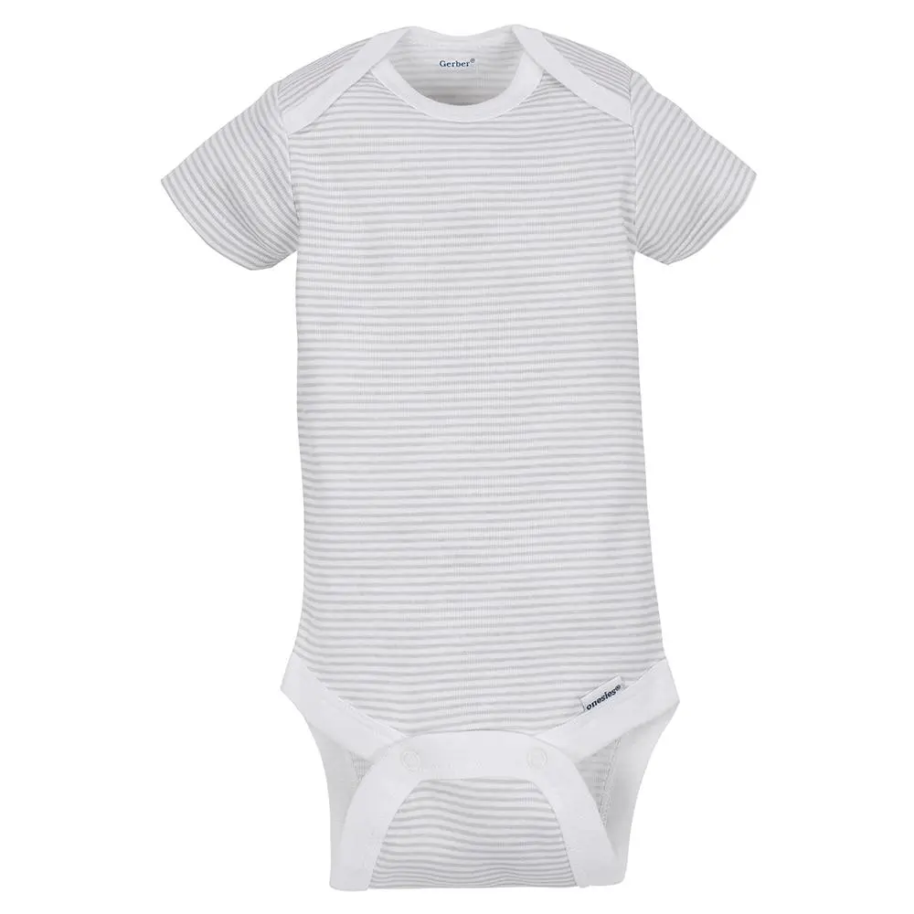 Add some fun to your little one's look with this 5-pack of neutral variety Gerber Onesies® brand short sleeve bodysuits. There's an assortment of creative and interesting color combinations to choose from in this adorable set. Whimsical designs that feature screen-print and puff print make these pieces stand out. You'll enjoy pairing these items with other favorites from this collection or mixing and matching with your wardrobe favorites. Each bodysuit is made from 100% cotton for a soft and breathable feel. Whether the day calls for running errands around town with mom or heading out play the day away with pint-sized friends, these bodysuits will keep your little one feeling fantastic. The handy higher-in-the-front, bottom snap opening keeps diaper changes easier for busy moms. An expandable lap shoulder neckline allows the bodysuit to pass easily over baby's head. This set comes in sizes that range from newborn to 6-9 months to keep your little one covered. The easy care fabric keeps laundry day simple.