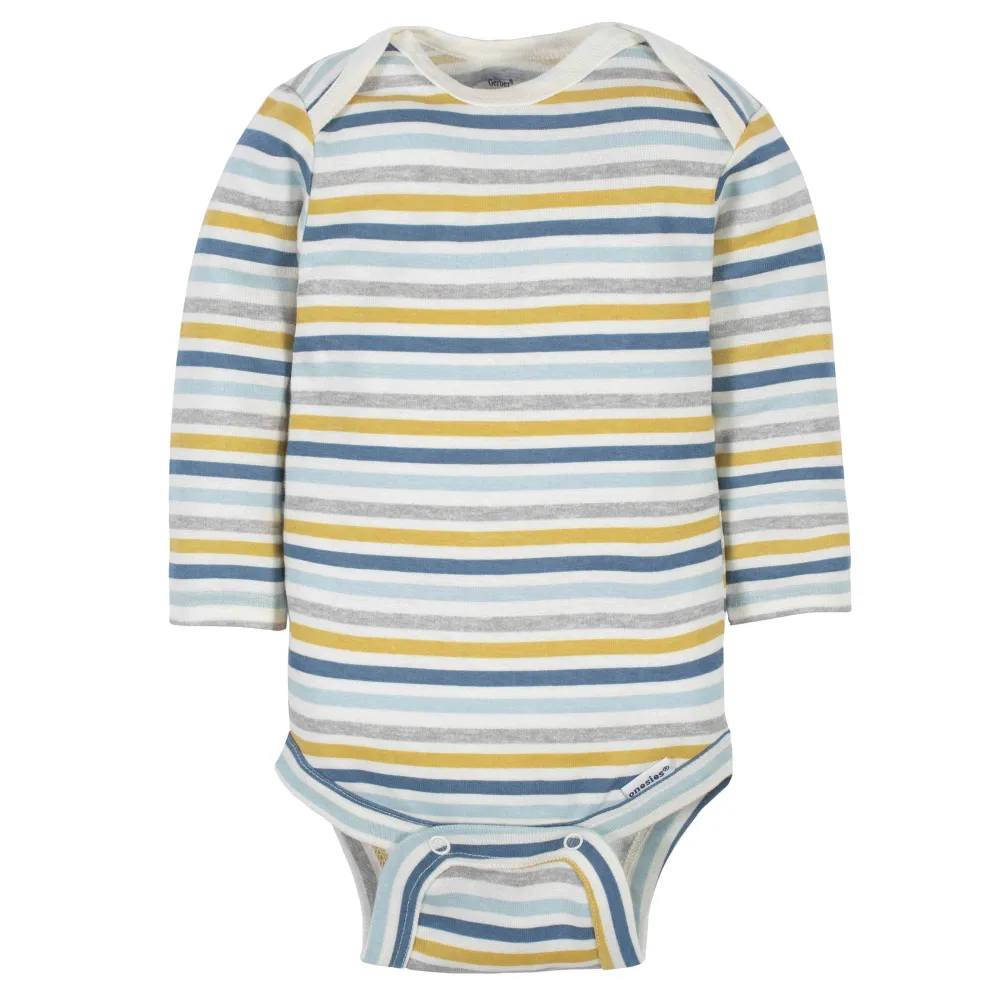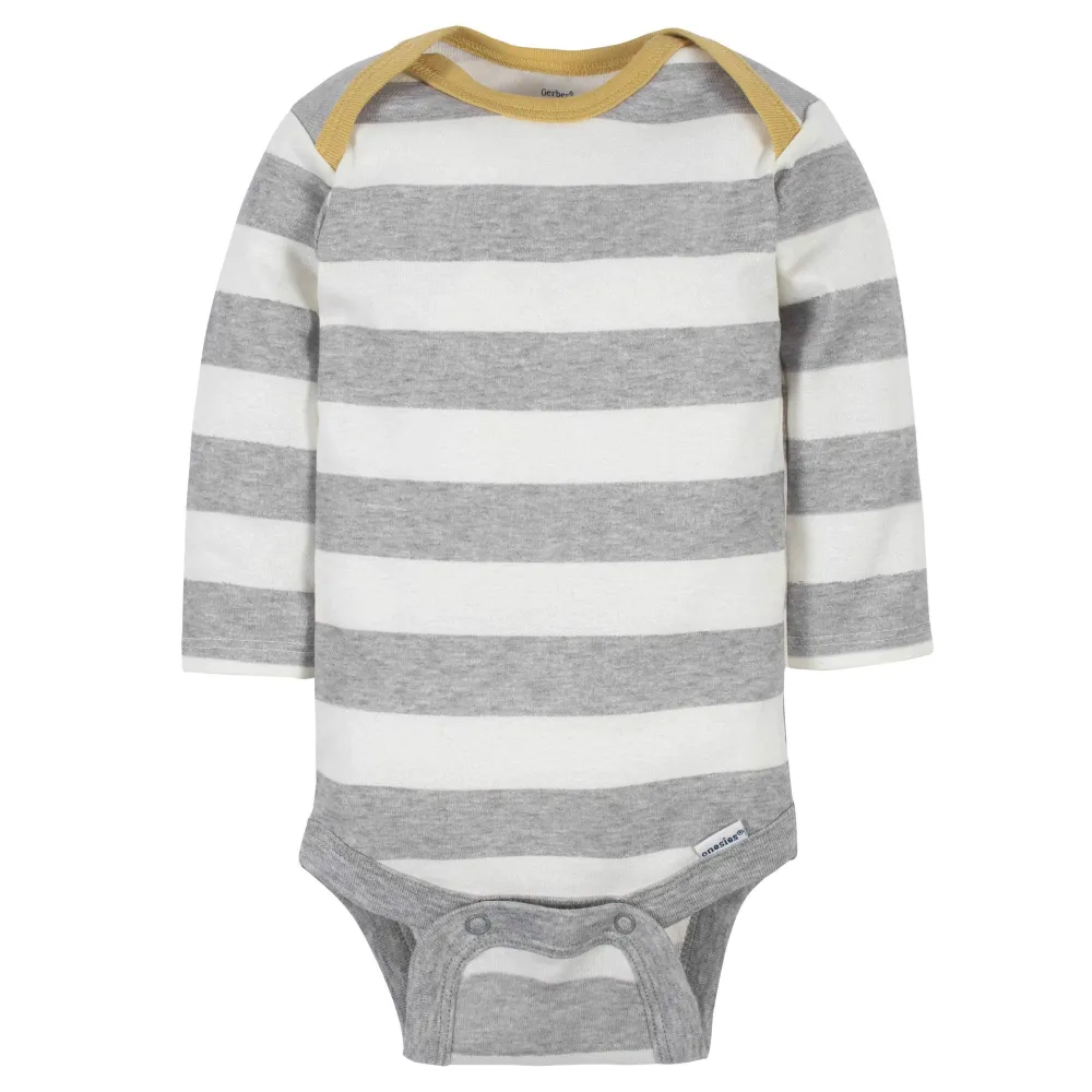 Baby Onesies® bodysuits are essential for baby! These adorable, assorted Onesies® bodysuits are made with a soft cotton fabric that’s perfectly comfortable against baby’s delicate skin. Baby will love how breathable this material is! We had this product independently certified with STANDARD 100 by OEKO-TEX® so that you don’t have to worry about harmful substances in your baby’s clothing. This pack includes four bodysuits. These classic baby clothes feature lap shoulder necklines that make wardrobe changes easier than ever. The necklines allow the garment to slip over baby’s head in total comfort. They also feature bottom snap enclosures that are conveniently positioned higher in front to quicken diaper changes. Gerber® Onesies® bodysuits are machine washable and machine dryable. Gerber® offers quality products that parents trust to bring their babies style and comfort.