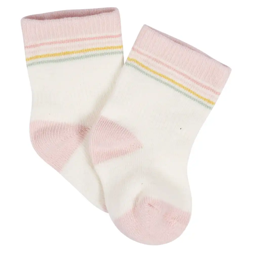 Our Wiggle Proof® socks stay right where they’re meant to, on baby’s feet! Each pair is made with soft, stretchy fabric to cradle those tiny toes in nothing but comfort. We use STANDARD 100 by OEKO-TEX® certification on products tested in an independent laboratory against a list of more than 400 harmful substances, including PFAS. This pack includes eight pairs of jersey crew socks with rainbow and floral themed art.