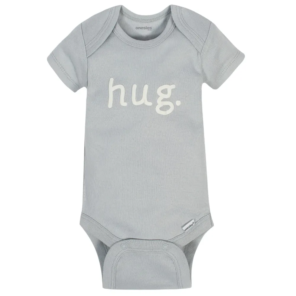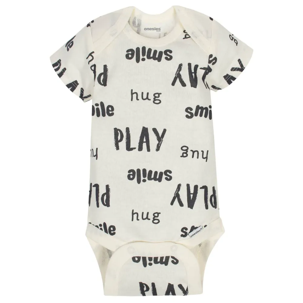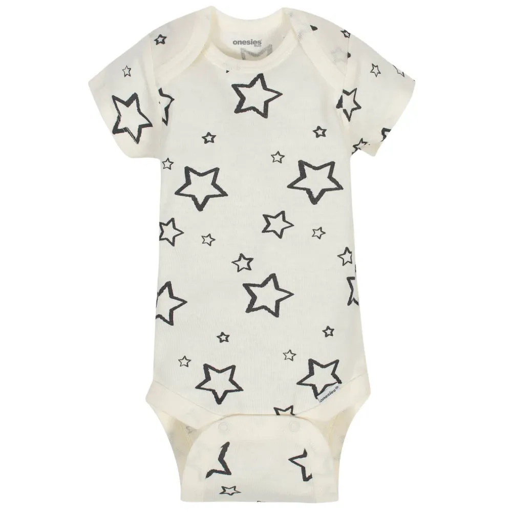 Baby Onesies® bodysuits are stylish and comfortable! These adorable, asorted Onesies® bodysuits are made with a soft cotton fabric thats perfectly comfortable against babys delicate skin. Baby will love how breathable this material is! This pack includes eight bodysuits. Pair them with baby pants, baby shorts, or cute baby socks to create fun and comfortable outfits your baby boy is sure to love! These classic baby clothes feature lap shoulder necklines that make wardrobe changes easier than ever. The necklines allow the garment to slip over babys head in total comfort. They also feature bottom snap enclosures that are conveniently positioned higher in front to quicken diaper changes. Adorable and affordable, these bodysuits truly are high-quality. Onesies® bodysuits are perfect for any little one with style.