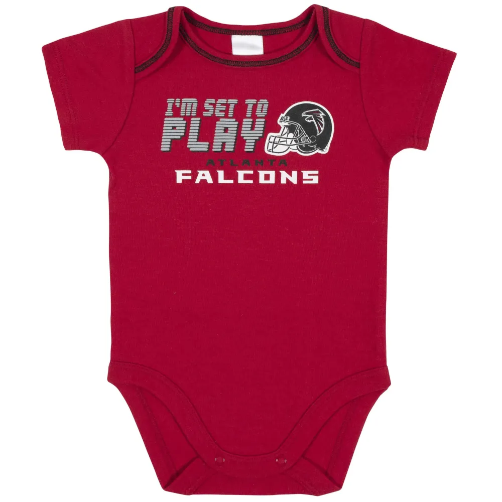 Boast your baby’s Falcons pride with this 3-piece bodysuit, Sleep 'n Play, and cap set! This officially licensed NFL outfit is made with a soft cotton and polyester interlock to keep baby comfortable and content all game long. The bodysuit features an expandable lap shoulder neckline with high-positioned bottom snaps to keep changes quick and simple. It also has a bright and bold, screenprint team logo front and center. The Sleep 'n Play boasts a colorful print of your team’s logos and helmets and features inner thigh snaps and a back placket for comfort and convenience. The knotted cap features a soft cuff for comfort and will keep your little one snuggly warm in cool weather This outfit is machine washable and dryable. It includes one bodysuit, one cap, and one Sleep 'n Play.