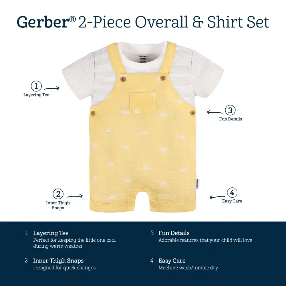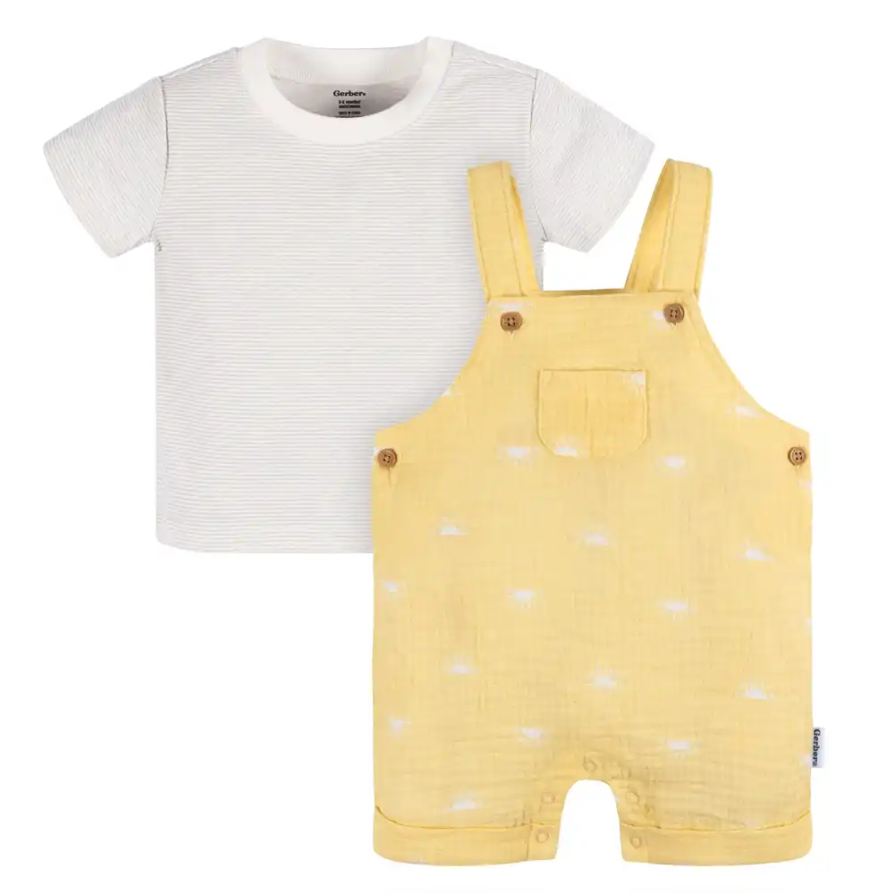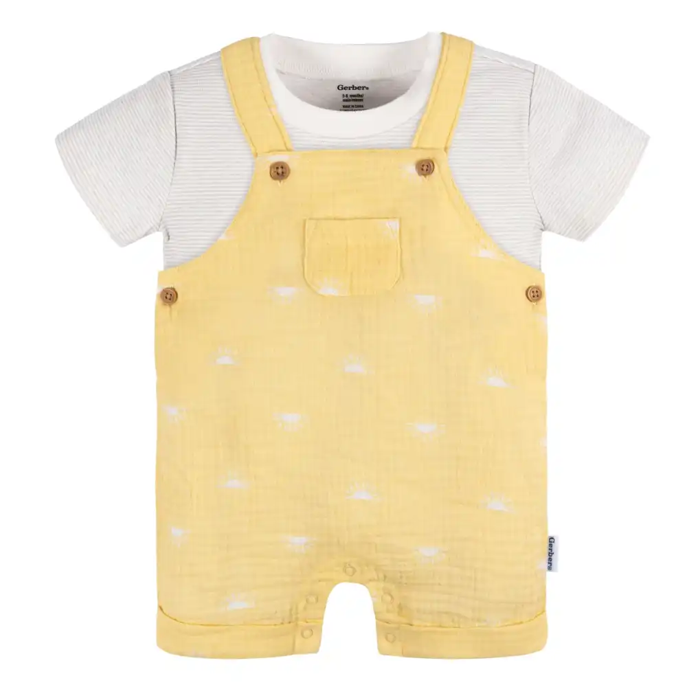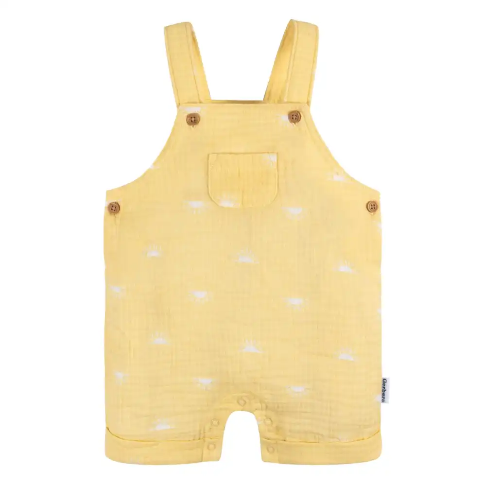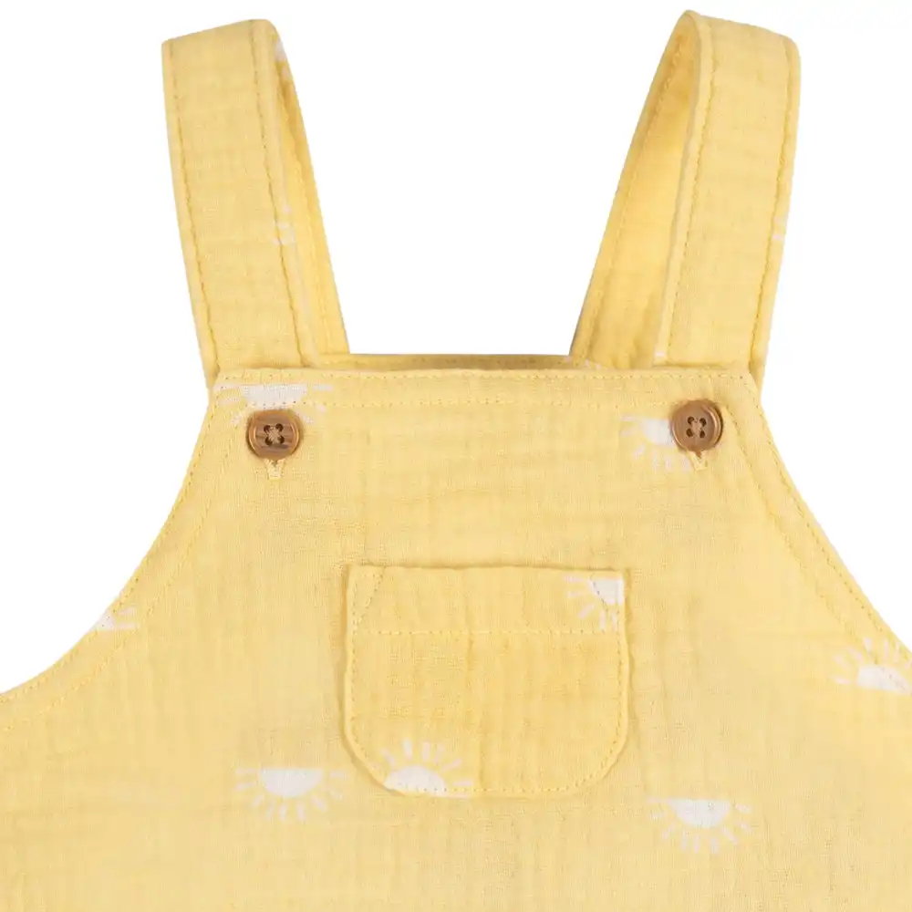 Embrace sun-filled days with our delightful, gender-neutral baby overall sunrise romper, perfect for your little one. Crafted from 100% cotton gauze, this romper with a T-shirt ensures a lightweight, breathable fit, keeping your baby boy or baby girl comfortably cool during their playtime. The t-shirt, primarily made from cotton peached jersey, offers a gentle stretch, allowing your little one to move freely. The soft, ribbed neckline, enhanced with spandex, adds even more flexibility. Whether it's playdates or everyday activities, this romper and t-shirt combination ensures that your little one not only looks adorable but also feels great all day long. Our essentials have been independently certified with STANDARD 100 by OEKO-TEX® so that you don’t have to worry about harmful substances in your baby’s wardrobe. This pack includes one sunrise romper with a T-shirt.