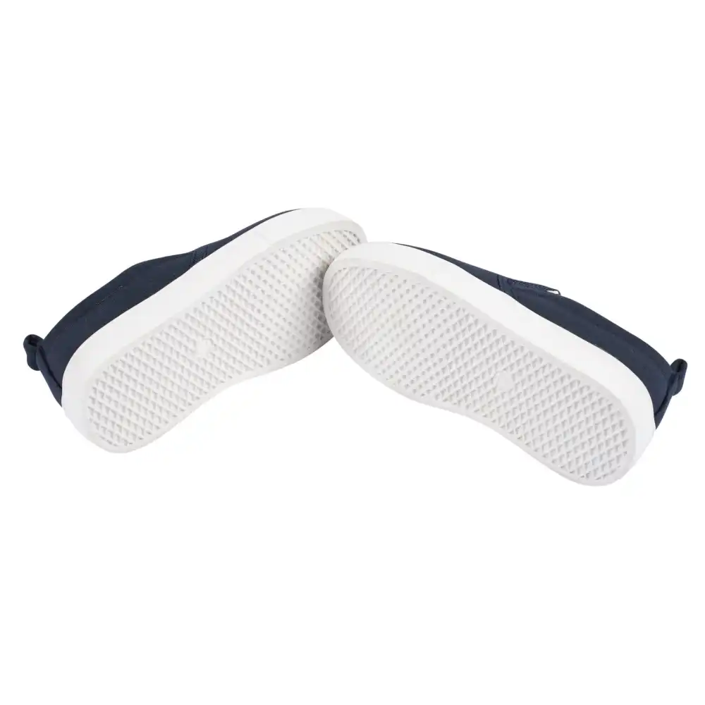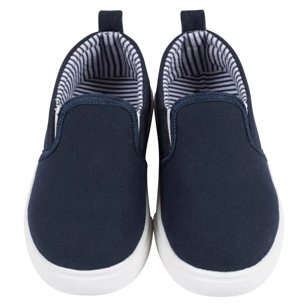 This toddler boy shoe is perfect for more formal events when dressing up a little may be necessary. Made from 100% cotton canvas with an interior poly jersey lining and no-skid sole for a secure, comfortable wear. Pack includes one pair of navy slip-on shoes.