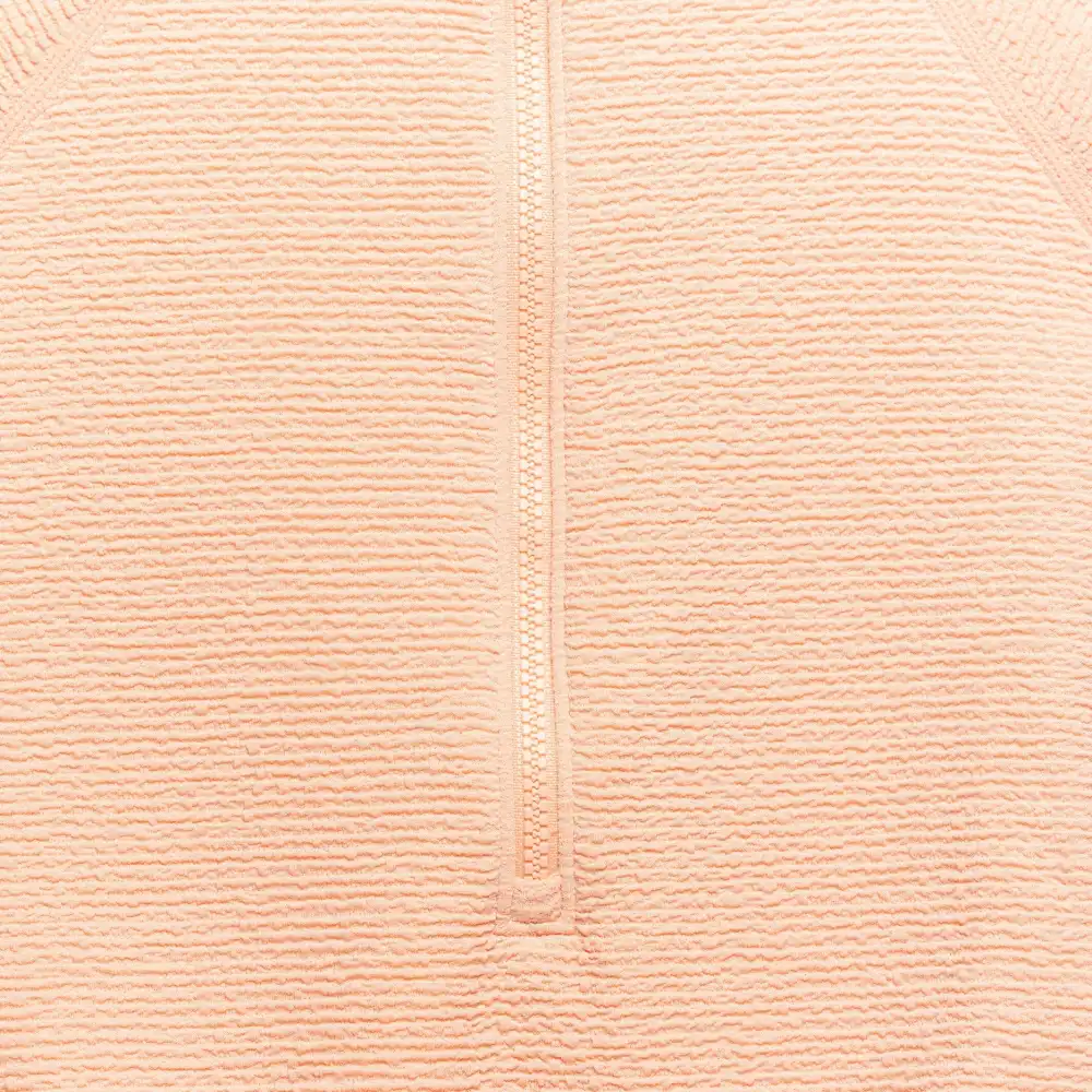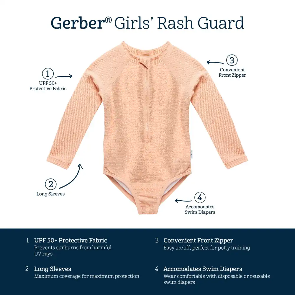 Our toddler girl's rash guard is a must-have for a super fun day in the water! It’s crafted from UPF 50+ fabric to keep your little one safe from harmful rays and designed to prevent skin irritation for safe water fun. Whether you're hitting the beach or the pool, this rash guard is the way to go. With a handy half-zipper and chin guard to prevent accidental pinches for easy dressing, the cool color keep your little one looking stylish in their new swimwear! Our essentials have been independently certified with STANDARD 100 by OEKO-TEX® so that you don’t have to worry about harmful substances in your baby’s wardrobe. Includes one toddler rash guard.