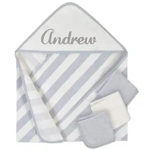Embroidered 4-Piece Neutral Striped Gray Hooded Towel & Washcloths Set