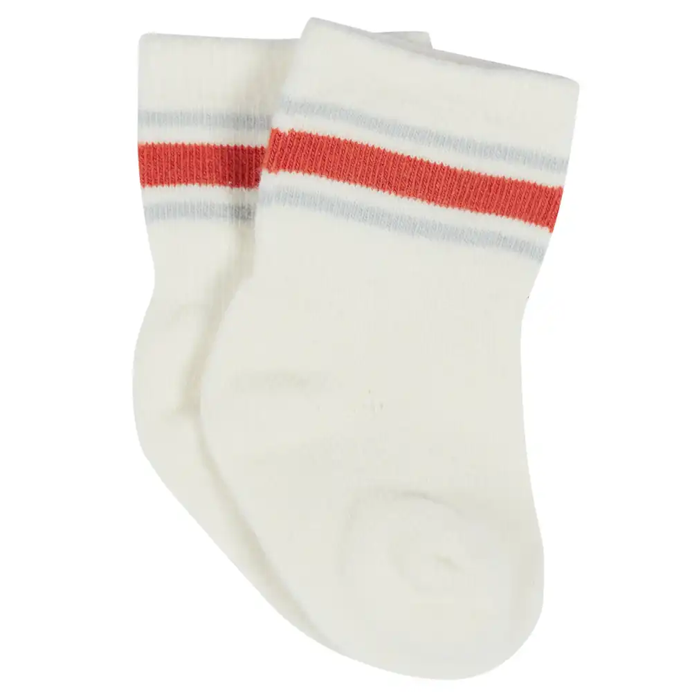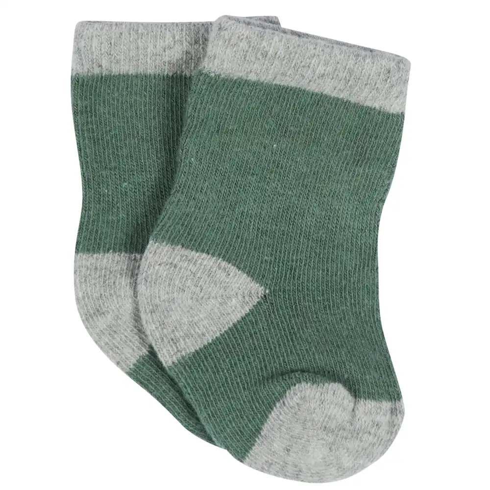 Our Wiggle Proof® socks are a parent’s best friend! Their soft, stretchy design keeps them held gently in place right where they should be, on baby’s feet! We use STANDARD 100 by OEKO-TEX® certification on products tested in an independent laboratory against a list of more than 400 harmful substances, including PFAS. This pack includes 12 pairs of Wiggle Proof® socks in a red, blue, and olive color scheme.