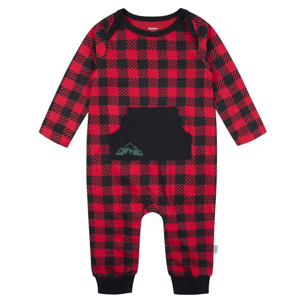 For active baby boys and toddler boys, jersey knit rompers are the perfect fall outfit. Made from 100% cotton, these durable rompers are easy on sensitive skin and hold up to rough everyday wear. With a cute rustic style of black and red plaid and a screenprint moose with evergreen trees, your little one will love exploring new territory in this outfit. Rompers have an easy pullover design with snaps at the legs for easy diaper changes. Our essentials have been independently certified with STANDARD 100 by OEKO-TEX® so that you don’t have to worry about harmful substances in your baby’s wardrobe. This pack includes two rompers.
