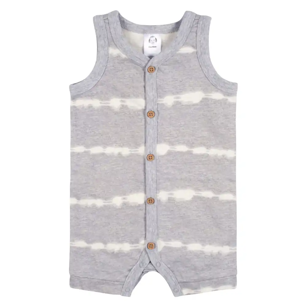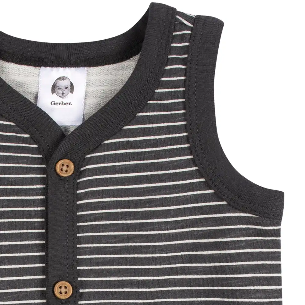 Gerber brings cute style to your little one’s wardrobe. Each of our sleeveless rompers is designed for easy on and off. They’re made with super soft cotton terry fabric for all-day comfort and easy care. We had our essentials independently certified with STANDARD 100 by OEKO-TEX so that you don’t have to worry about harmful substances in your baby’s clothing. Includes two baby boy heather and dark grey sleeveless rompers.