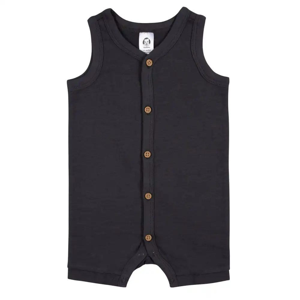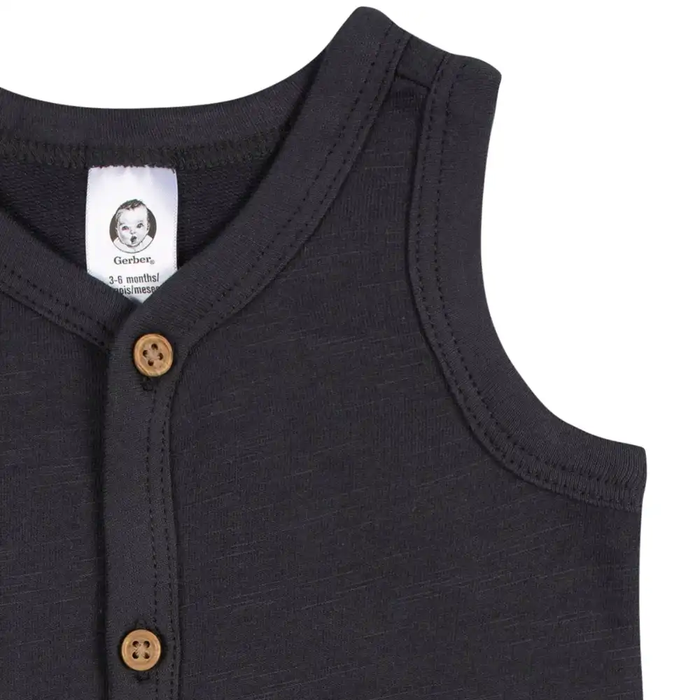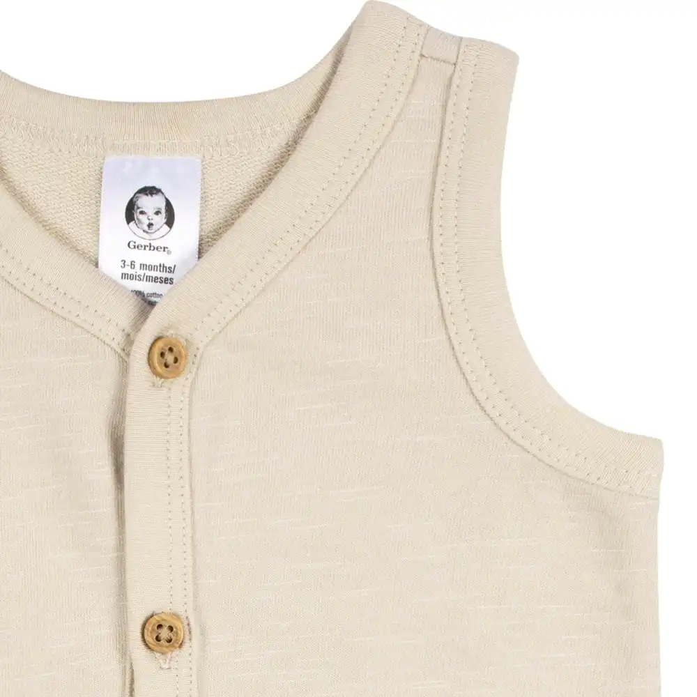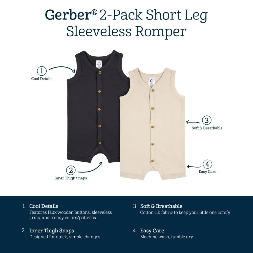 Gerber brings cute style to your little one’s wardrobe. Each of our sleeveless rompers is designed for easy on and off. They’re made with super soft cotton terry fabric for all-day comfort and easy care. We had our essentials independently certified with STANDARD 100 by OEKO-TEX so that you don’t have to worry about harmful substances in your baby’s clothing. Includes two baby boy tan and dark grey sleeveless rompers.