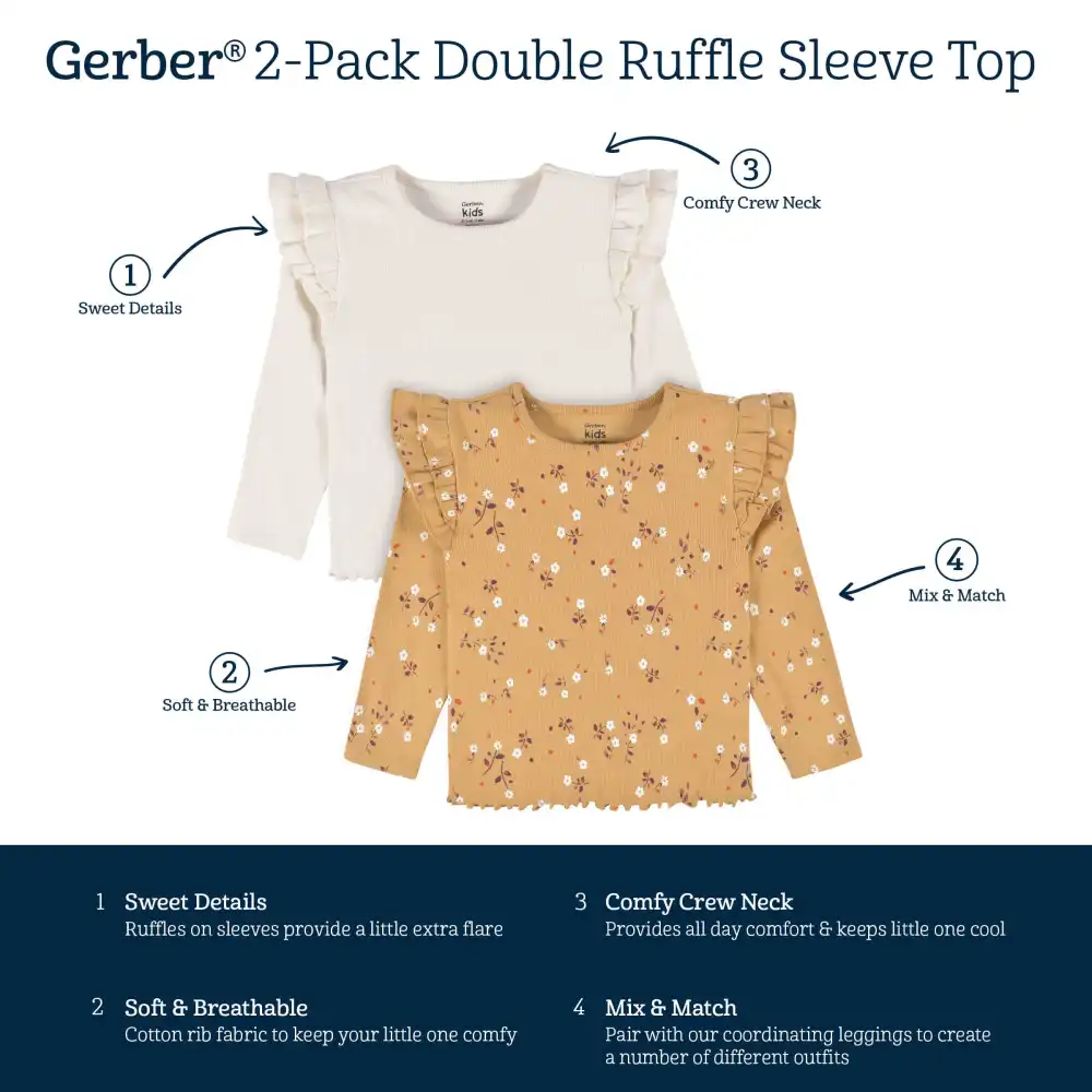 Our long sleeve double ruffle tops are the perfect fall staple! Each top is designed for easy dressing and all-day comfort, perfect for infants and toddlers. We use STANDARD 100 by OEKO-TEX® certification on products tested in an independent laboratory against a list of more than 400 harmful substances, including PFAS. Pair these mustard floral themed tops with our coordinating printed or solid leggings for all day play!