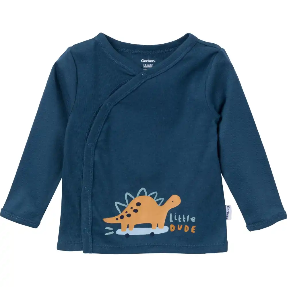 Dress your baby in style with this adorable 3-piece set, made from 100% cotton, to be gentle on sensitive skin. The side snap shirt is perfect for healing belly buttons and features a cute dinosaur on a skateboard with the text "little dude." The pull-on pants have a stretchy waistband for a comfortable, secure fit, and the footie style keeps tiny toes warm and cozy. Completing the look is a matching cap with blue and white stripes. This Take-Me-Home set is an adorable first baby outfit and makes for a great baby shower gift. Our essentials have been independently certified with STANDARD 100 by OEKO-TEX® so that you don’t have to worry about harmful substances in your baby’s wardrobe. This multi-piece set includes 1 shirt, 1 footie pants, and 1 cap.