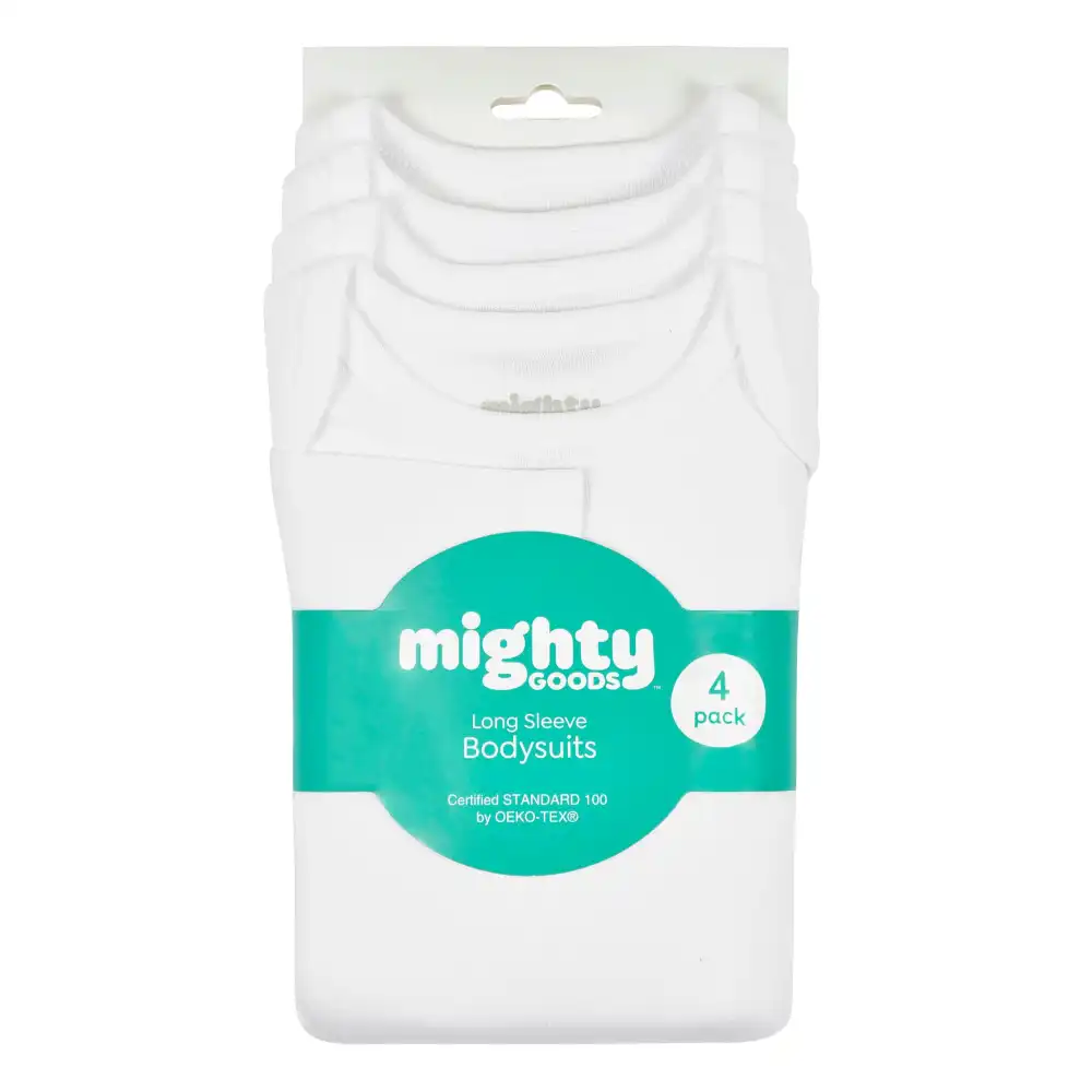 This four pack of white Mighty Goods bodysuits is the perfect addition to any baby’s wardrobe. They are made with 100% cotton, which is a safe, soft fabric that is ideal for baby’s sensitive skin. They are the perfect apparel to use for layering to keep baby warm, but they are also great worn all on their own! These bodysuits are designed with you in mind, as the bottom snap is higher in front to provide for easy diaper and outfit changes. The long sleeves lend well for layering when the weather is colder. Plus, these long sleeve bodysuits are easy to clean! They are machine washable and dryable, so laundry isn’t quite as much of a hassle. These white bodysuits truly are a must-have for baby, which makes them a great shower gift! They’re safe, practical, comfortable, and down-right cute!