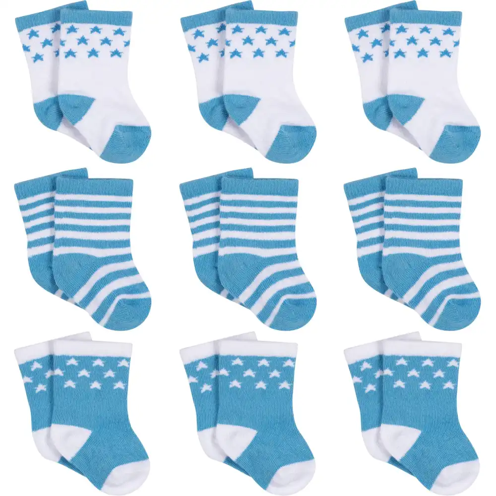 Baby boys' busy feet and toes feel better in these comfy jersey crew socks! This 9-pack is made with a cotton blend jersey for a softer feel that has plenty of stretch. Spandex is woven in for a snug-fitting sock that's les likely to wriggle off. These socks offer a creative finishing touch to your favorite outfits. The easy care fabric helps to keep laundry day low key!