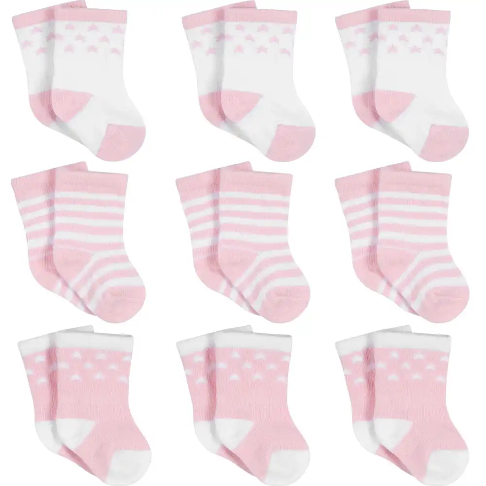 Baby girls' busy feet and toes feel better in these comfy jersey crew socks! This 9-pack is made with a cotton blend jersey for a softer feel that has plenty of stretch. Spandex is woven in for a snug-fitting sock that's les likely to wriggle off. These socks offer a creative finishing touch to your favorite outfits. The easy care fabric helps to keep laundry day low key!