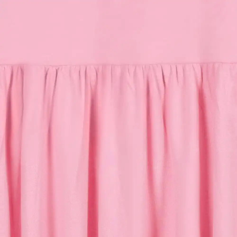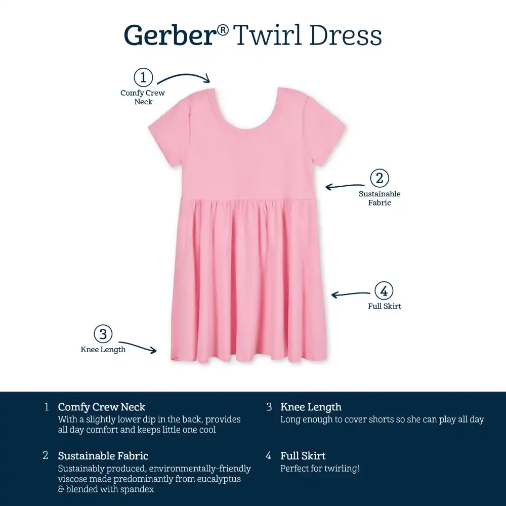 Designed for every season, our buttery soft collection of affordable rompers, sleepwear, Dresses and headbands will be their new wardrobe faves! We've partnered with Livaeco™ by Birla Cellulose to bring you and your little ones a more sustainably produced, environmentally-friendly viscose fiber collection made predominately from eucalyptus blended with spandex. This extremely soft solid bubblegum pink Dress is made for twirling. The perfect look for any occasion. High-quality, lightweight, breathable, durable fabric with the perfect amount of stretch for active babies and toddlers. Prints and solids made for sibling matching. This short sleeve twirl Dress is comfy fitting for all day wear. Gerber® quality, comfort, safety and value never goes out of style!