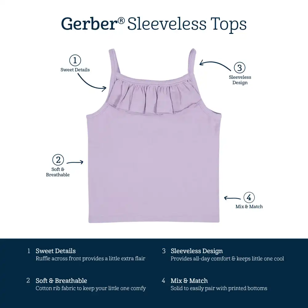 Our 2-pack sleeveless tops are the perfect spring and summer staple! Each top is designed for easy dressing and all-day comfort, perfect for infants and toddlers. We use STANDARD 100 by OEKO-TEX® certification on products tested in an independent laboratory against a list of more than 400 harmful substances, including PFAS. Pair these purple and pink tops with our coordinating printed or solid leggings and shorts for all day play!