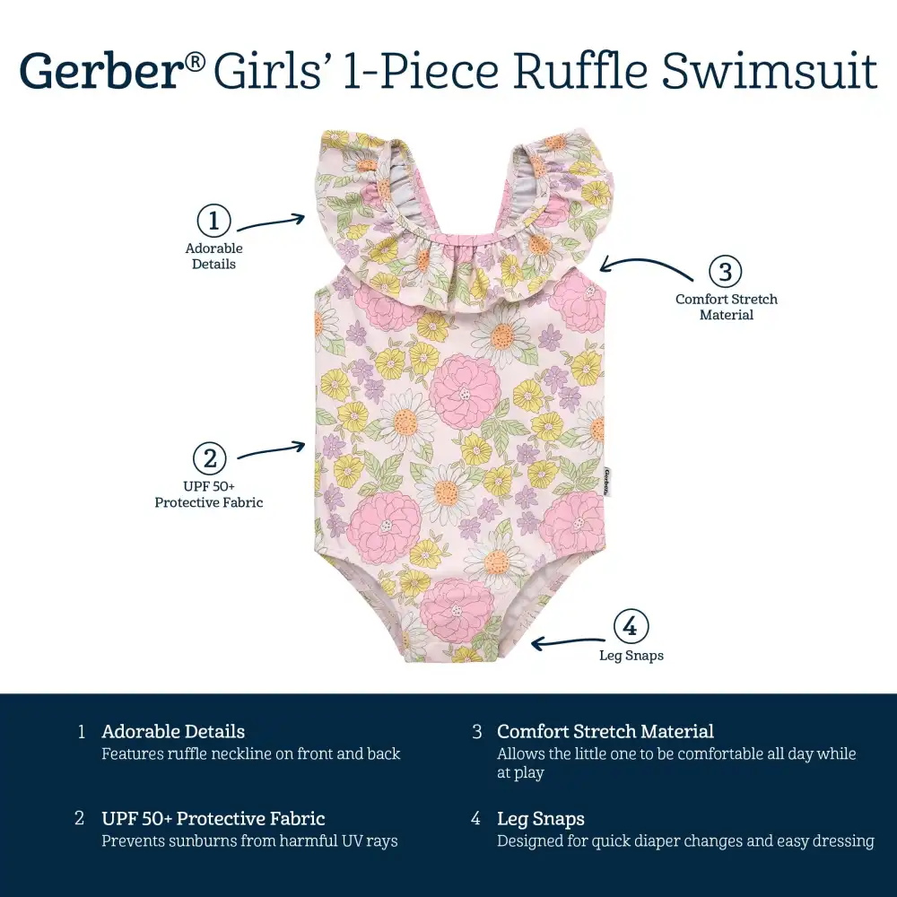 Give your baby girl this trendy one-piece swimsuit that's an absolute delight. Featuring cute ruffles and an endearing pattern, it's the perfect option for vacation getaways or splashing around in your backyard. Made from UPF 50+ material, it ensures her playtime is secure and stylish under the sun. Our essentials have been independently certified with STANDARD 100 by OEKO-TEX® so that you don’t have to worry about harmful substances in your baby’s wardrobe. Includes one-piece swimsuit.