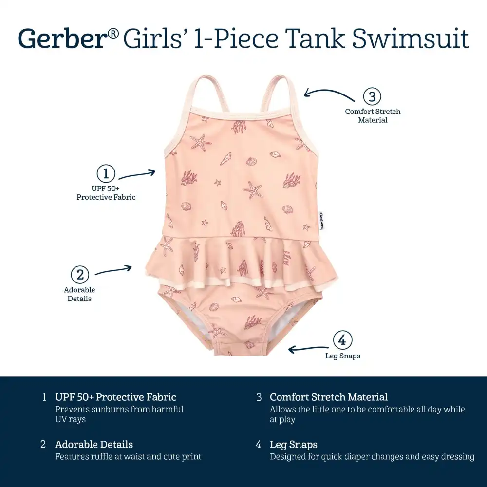 Grab this trendy one-piece swimsuit for your little one. It's so cute with ruffles and a sweet design. Great for family vacations or just splashing around in the pool. And it's made from UPF 50+ fabric, so she'll be safe and stylish while having fun in the sun. Our essentials have been independently certified with STANDARD 100 by OEKO-TEX® so that you don’t have to worry about harmful substances in your baby’s wardrobe. Includes one-piece swimsuit.