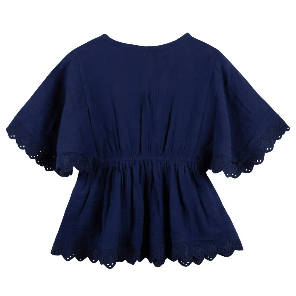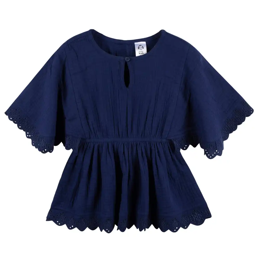 Dress your little girl in style with this navy gauze kaftan coverup. Perfect for the beach or pool, it features delicate crochet trim and a playful tunic design. Made for toddlers and babies, this swim coverup is the perfect addition to her summer wardrobe.