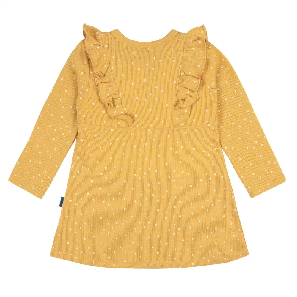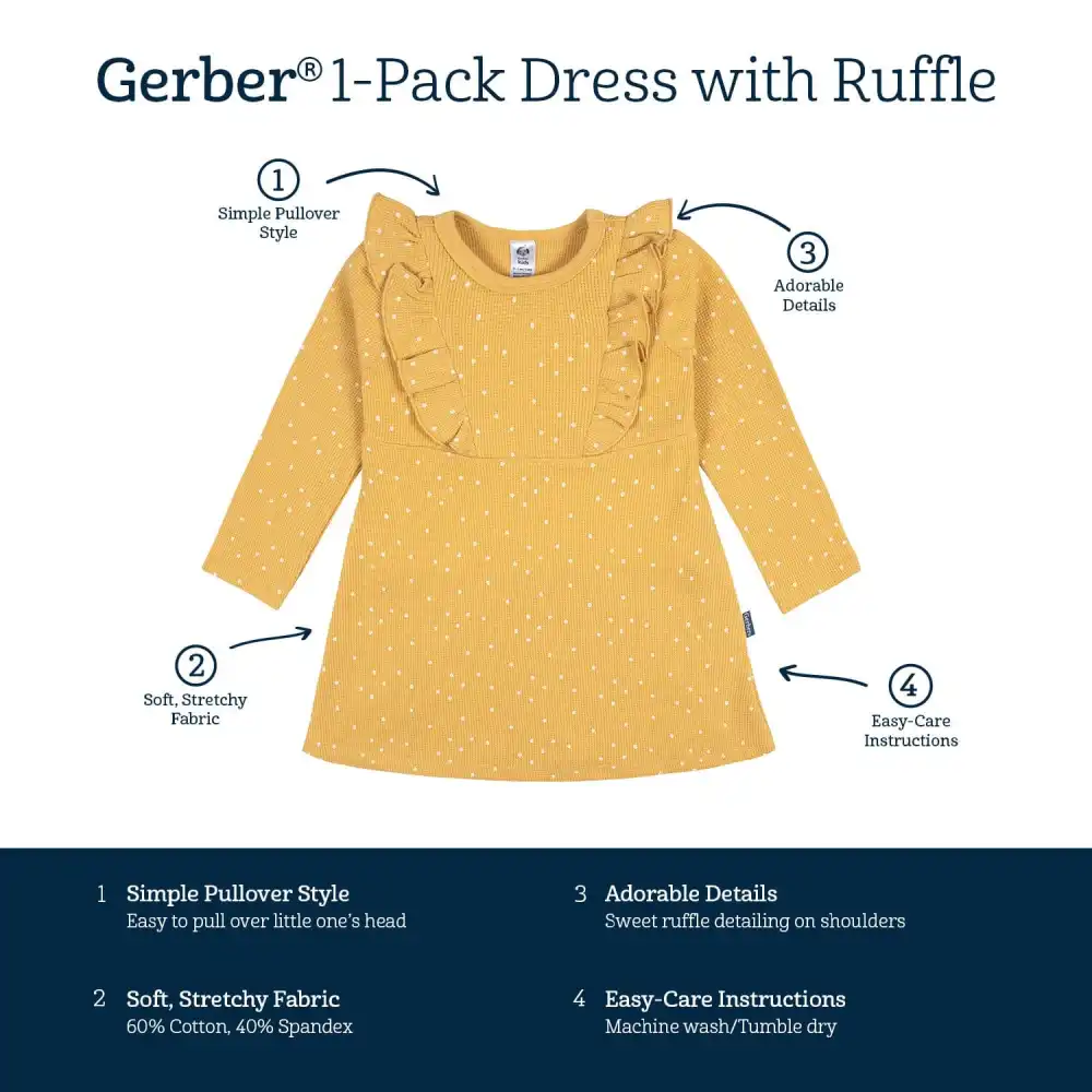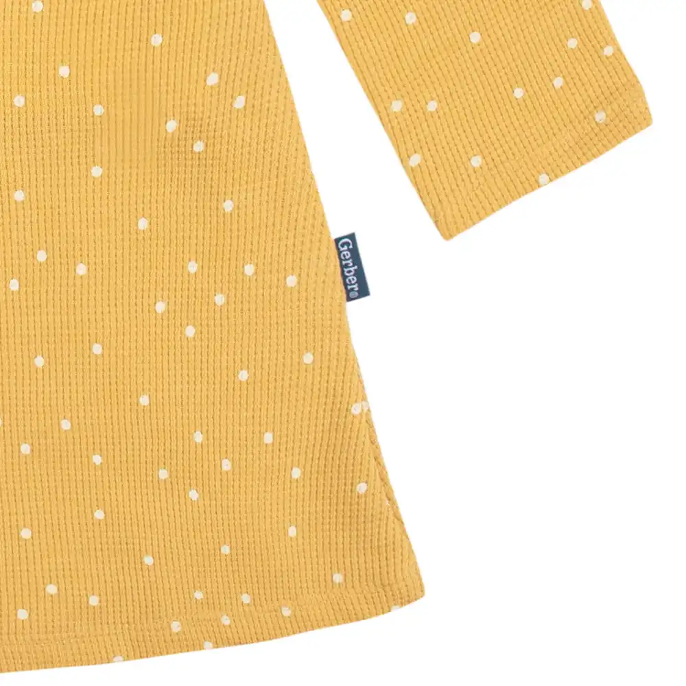 This long sleeve, yellow polka dot dress featuring adorable shoulder ruffles is the perfect addition to your baby girl or toddler girl’s wardrobe. Super soft and comfortable, this dress is made from a cotton and polyester blend to keep your little one happy all day. With an easy pullover style and simple machine wash care, this low-maintenance dress will be a favorite for everyone. Our essentials have been independently certified with STANDARD 100 by OEKO-TEX® so that you don’t have to worry about harmful substances in your baby’s wardrobe. This pack includes one dress.