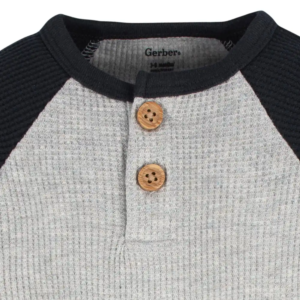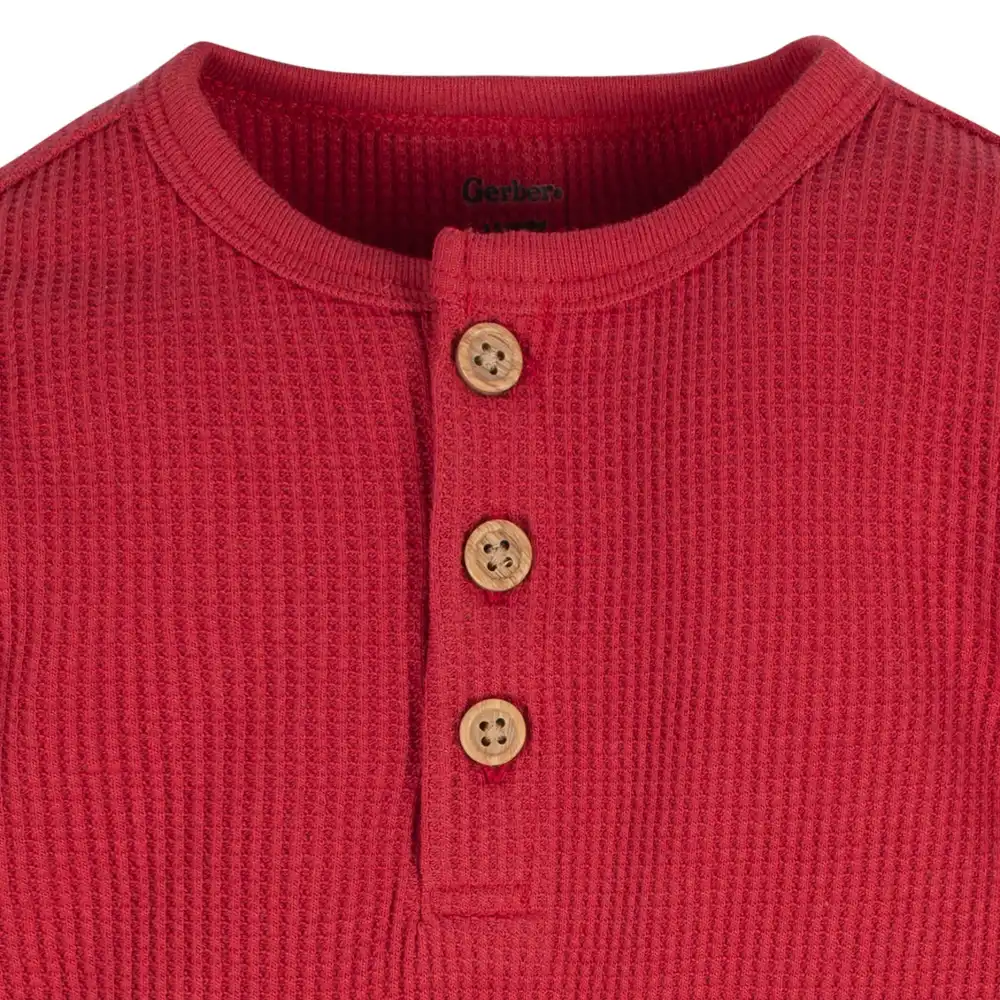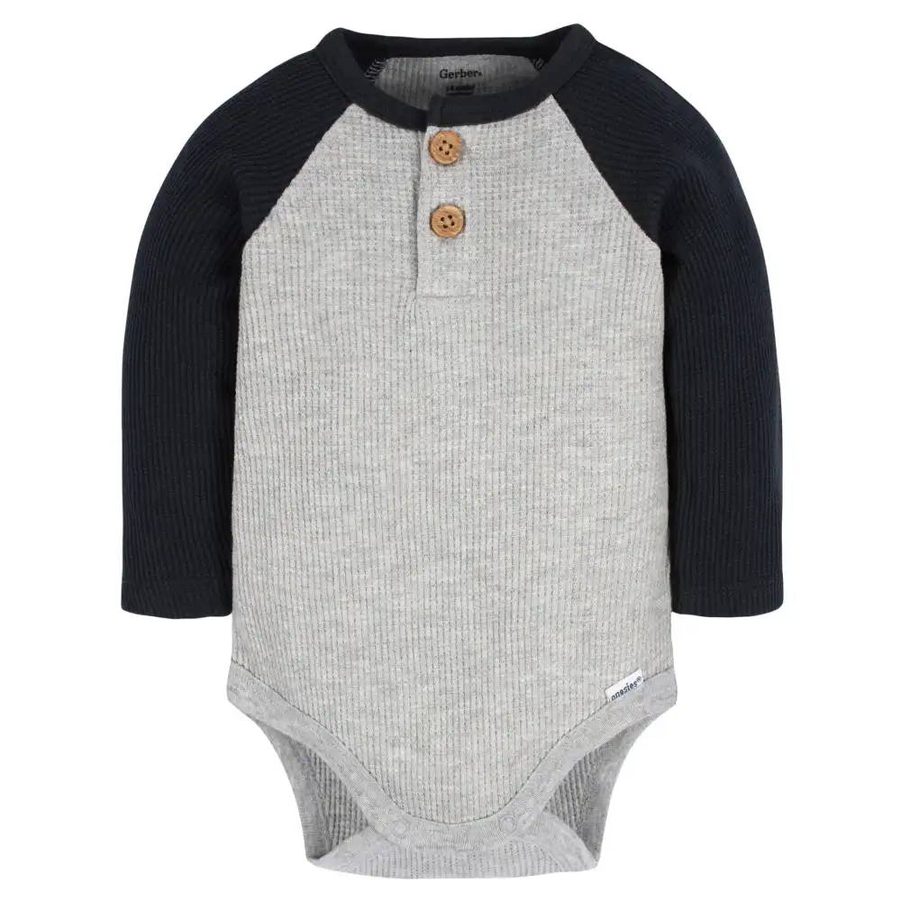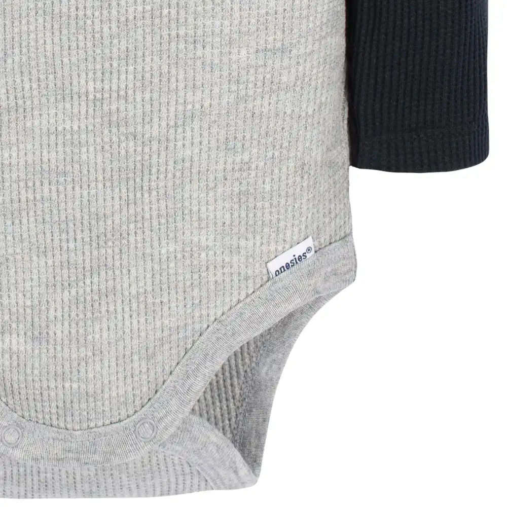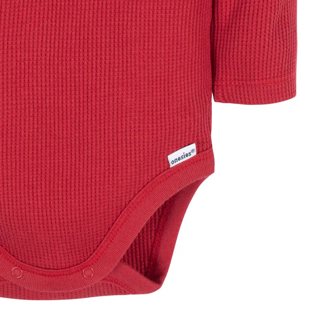 Keep your baby boy comfy and cozy all season long with these long sleeve Onesies® Brand Bodysuits. Easy to use as a fast, one-piece or layer on cooler days, your baby boy or toddler boy will be cozy all day long thanks to comfort-stretch legs and neckline. Leg snaps provide a secure fit and fast way to change diapers, while the partial button-down top allows you to customize the snug feeling to your little one’s preference. Our essentials have been independently certified with STANDARD 100 by OEKO-TEX® so that you don’t have to worry about harmful substances in your baby’s wardrobe. This pack includes one solid red and one black and grey Onesies® Brand Bodysuit.