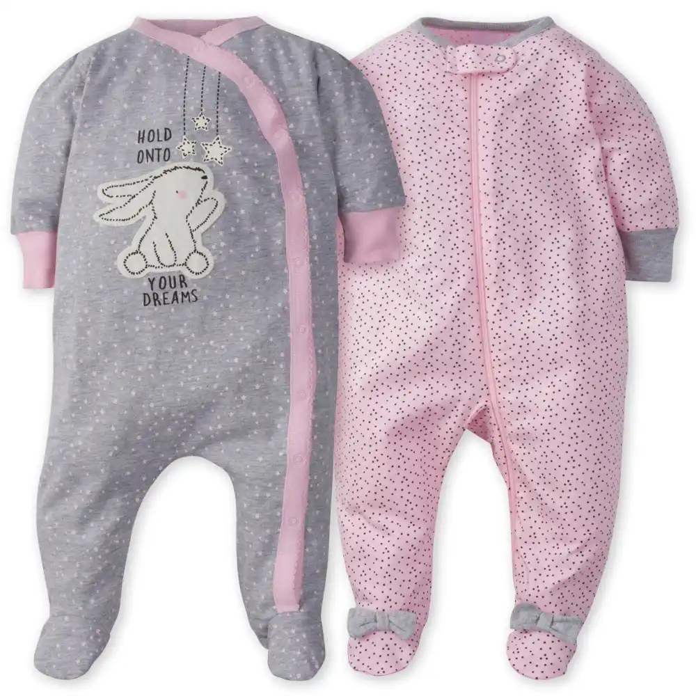 Keep her snug in this 2-Pack of Sleep 'N Plays! The Sleep 'N Plays are cute, comfortable, and machine washable. Made with soft cotton and footed for warmth, they're perfect to wear during the day as well as to sleep in at night. One sleep 'n play features a front zipper with a snap at the top to prevent irritation. The other sleeper features snaps all the way down.