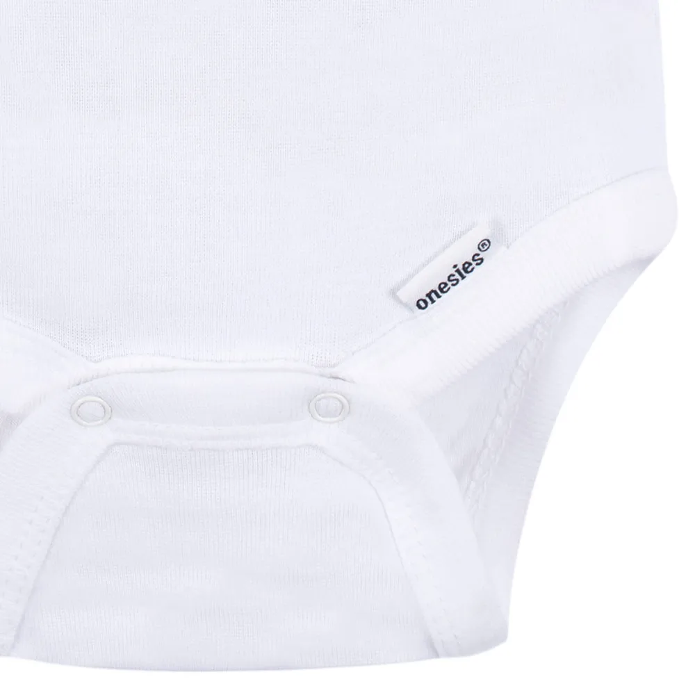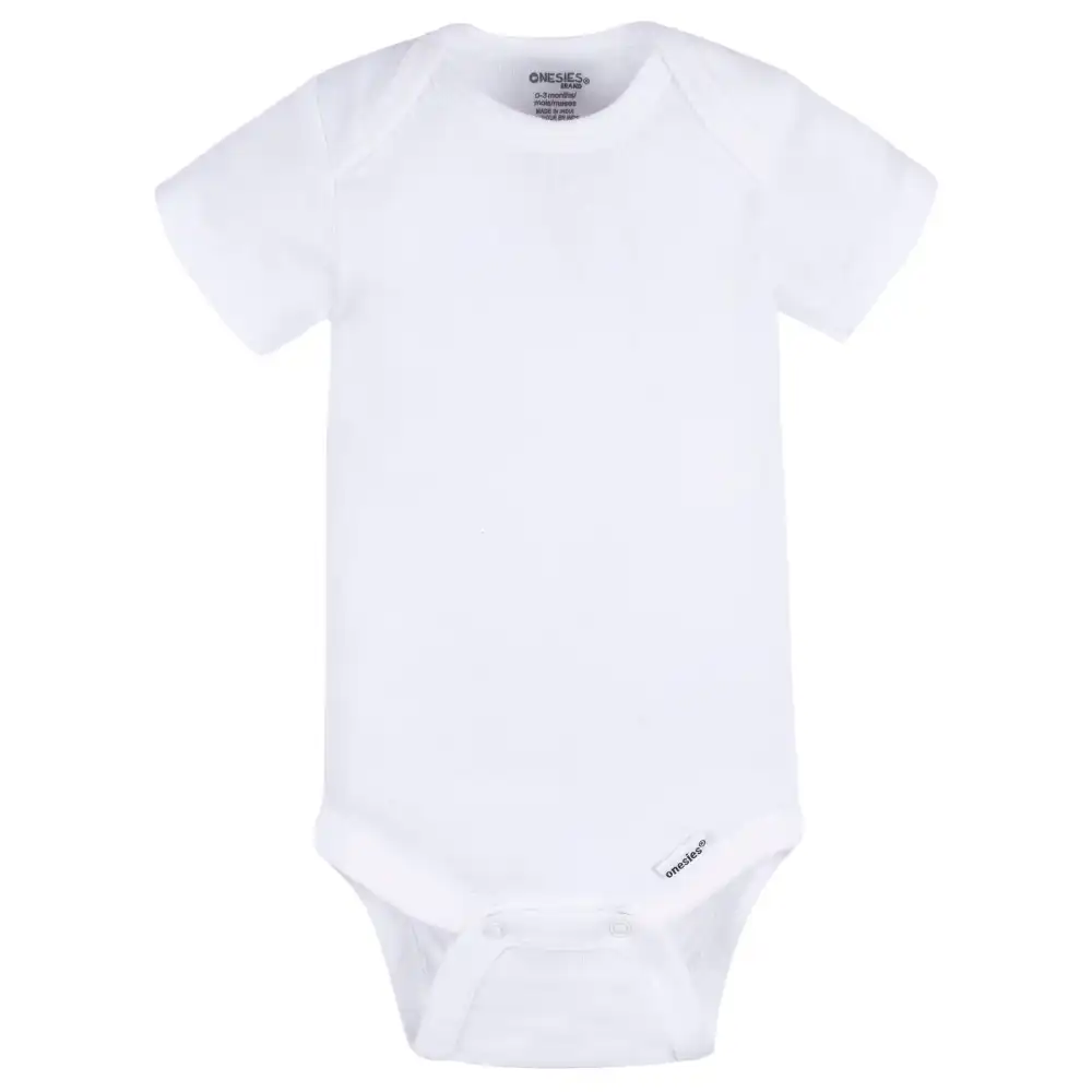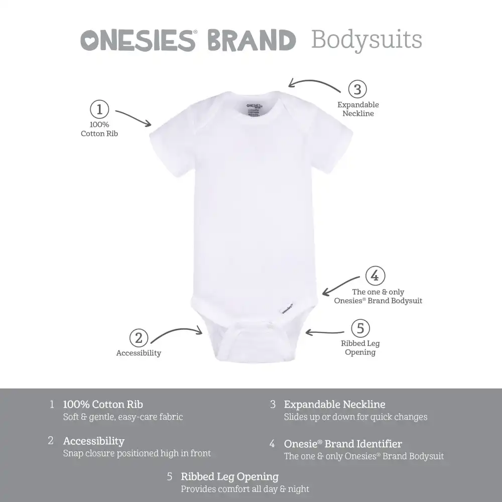 Rest easy knowing you're well-supplied with these baby essentials! This 2-pack of baby boy or girl unisex short sleeve Onesies® bodysuits is a versatile choice. The solid white color makes them perfect for pairing with any bottom. When used as a cozy underlayer, they'll keep your baby warm and comfortable in cooler weather. 100% cotton rib provides added breathability. A handy bottom snap closure simplifies diaper changing. An easily-expandable lap shoulder neckline makes them quick to pull on in the morning. Streamlined laundry days are guaranteed with the easy care, machine wash and dry fabric.
