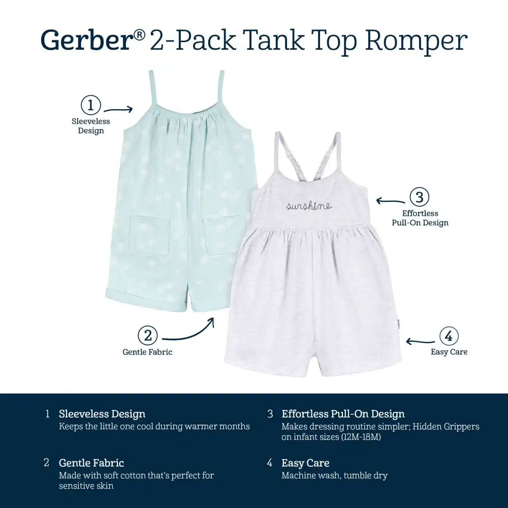 This two pack of sleeveless baby and toddler girl rompers is the perfect way to celebrate the arrival of sunny days! Made from 100% cotton with a slight stretch for a comfortable fit that’s gentle on sensitive skin, you’re little one will be happy to wear this again and again. The simple pull-on style makes dressing easy, and hidden grippers (in infant sizes only) help keep the outfit in place all day long. And with machine cleaning, it’s easy to keep clean for the entire season. Our essentials have been independently certified with STANDARD 100 by OEKO-TEX® so that you don’t have to worry about harmful substances in your little one’s wardrobe. Pack includes two rompers.