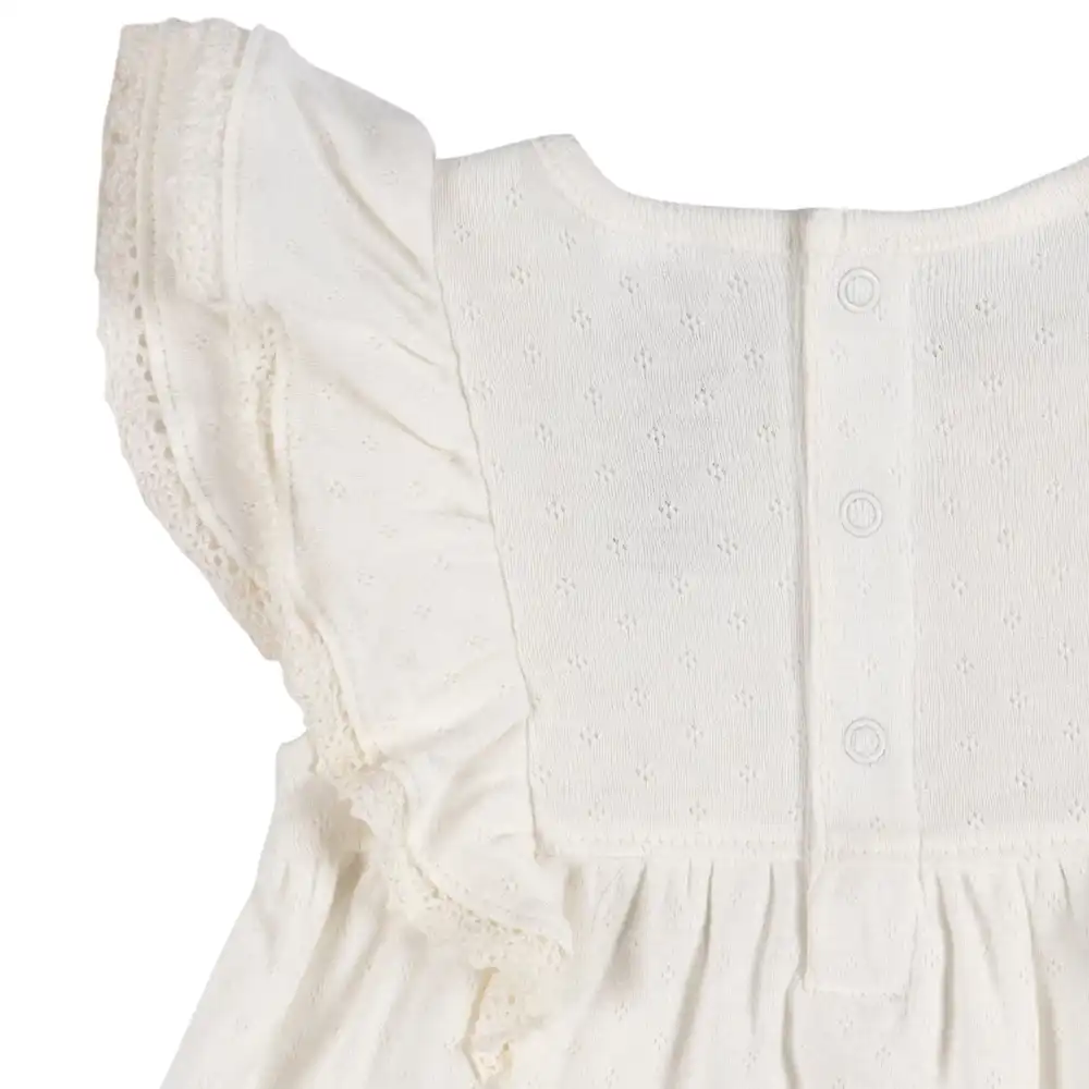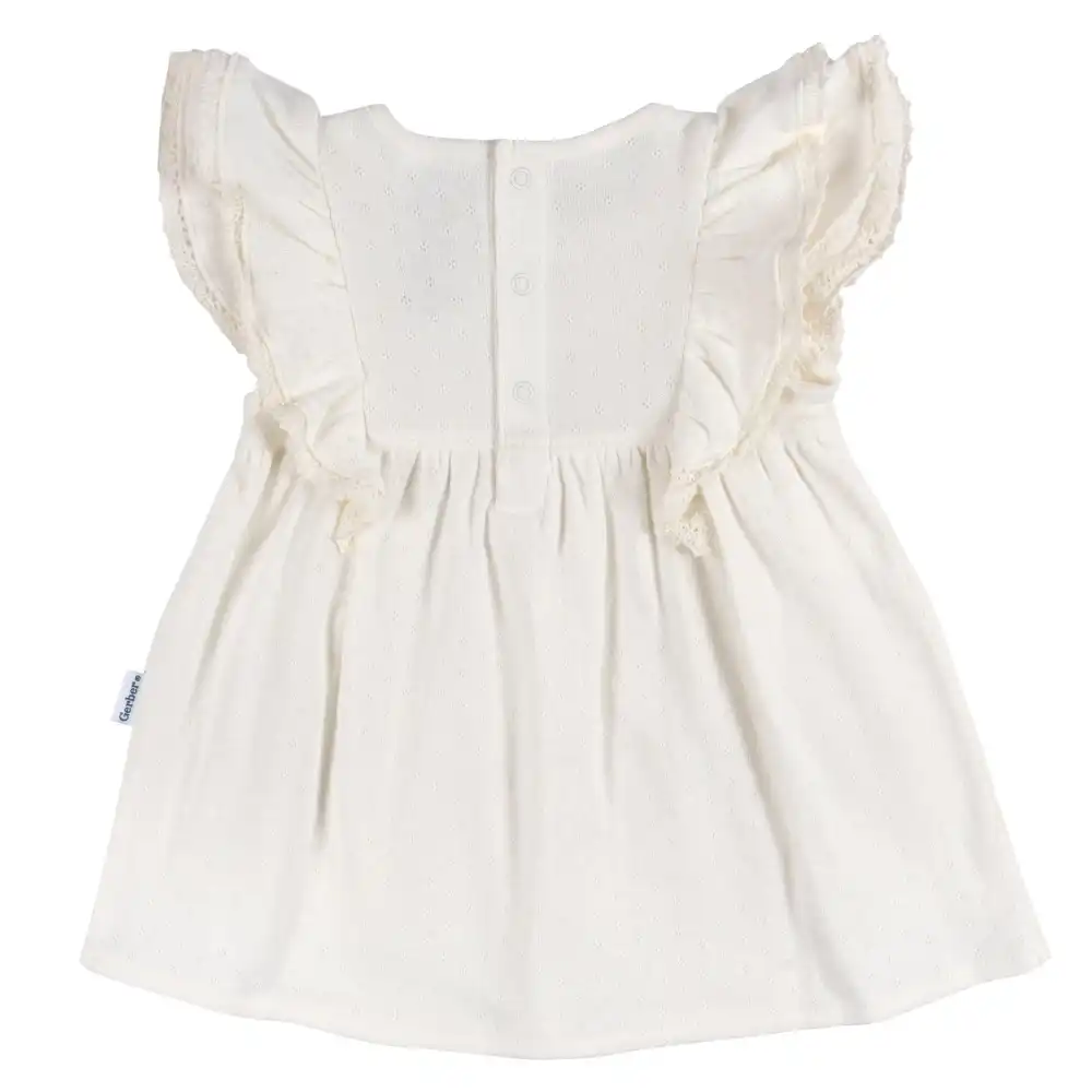 Your little one will radiate the charm of spring and summer with our baby girl dress and diaper cover set! Designed with her comfort in mind, this outfit is gentle on sensitive skin and boasts a soft, airy fit that's perfect for those sun-soaked adventures. Plus, the shoulder ruffles add a touch of elegance to her look, making this ensemble also ideal for special occasions. Dressing her is a breeze with the easy pull-on style and rear snaps, while the diaper cover can be easily removed for easy changes. And don't worry about playtime messes; it's machine washable, so you can let her enjoy every moment of summer in style. Our essentials have been independently certified with STANDARD 100 by OEKO-TEX® so that you don’t have to worry about harmful substances in your baby’s wardrobe. Includes one dress and diaper cover.