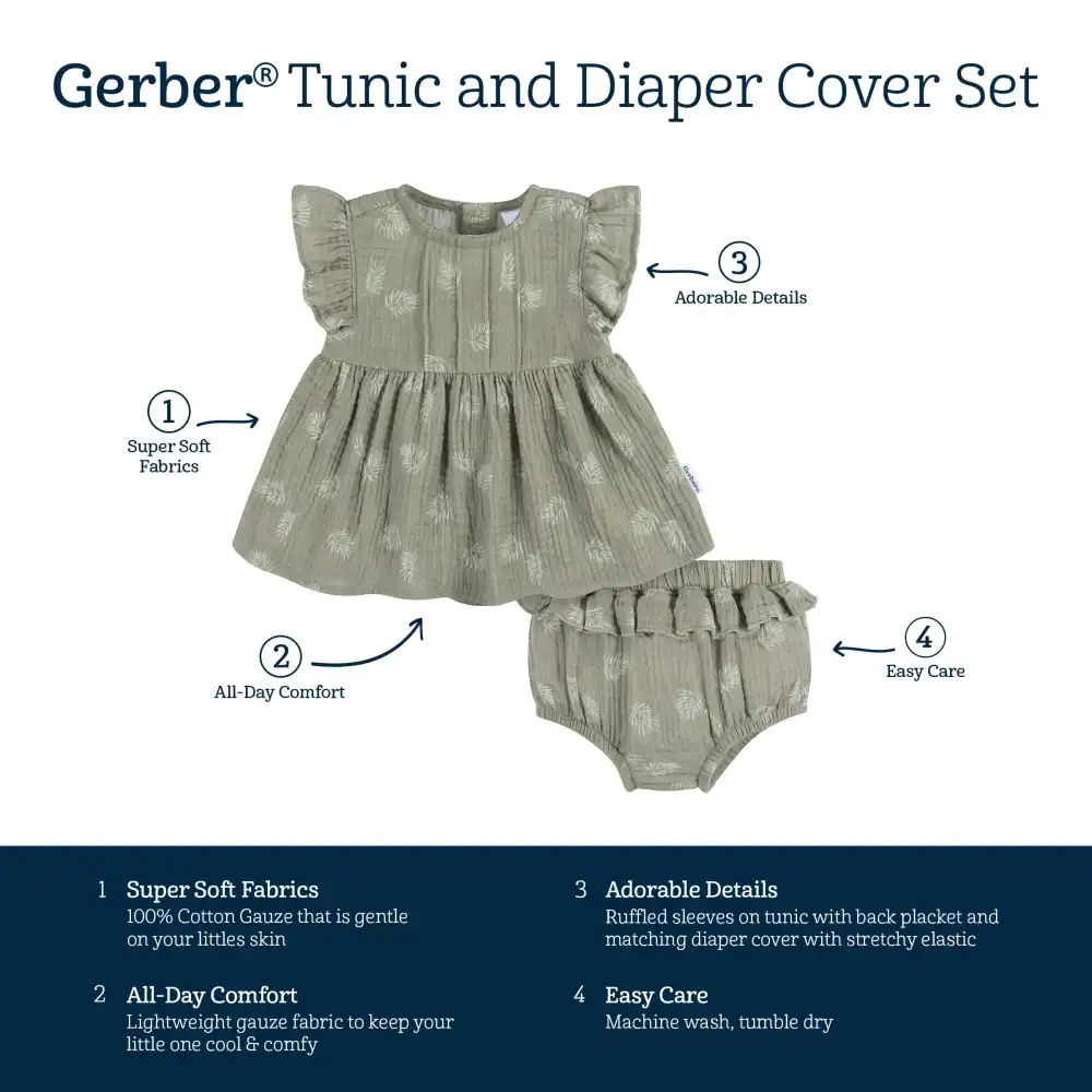 Dress your baby girl in comfort with our baby girl tunic and diaper cover set. Crafted from 100% cotton double layer gauze, it's gentle on sensitive skin and lightweight, ensuring she's comfortable all day long. This set is the perfect choice for sunny days, keeping her both stylish and comfortable as she plays and enjoys herself wherever you go. Our essentials have been independently certified with STANDARD 100 by OEKO-TEX® so that you don’t have to worry about harmful substances in your baby’s wardrobe. Includes one tunic with matching diaper cover.