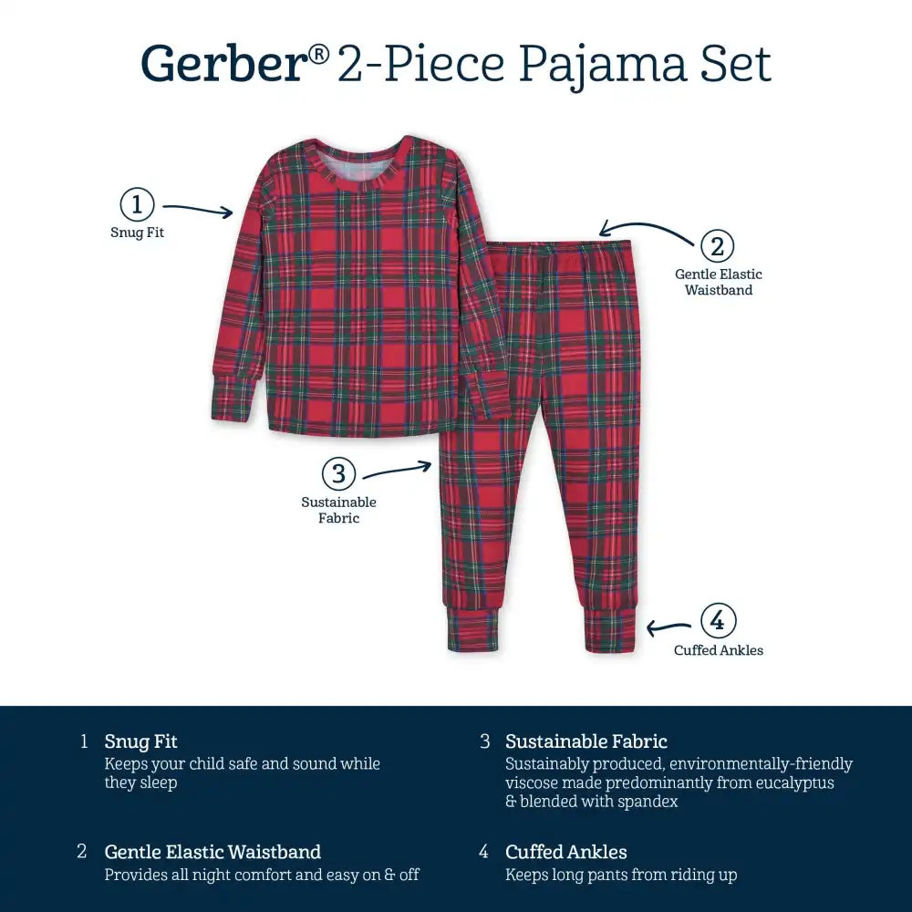 Designed for every season, our buttery soft collection of affordable rompers, sleepwear, Dresses and headbands will be their new wardrobe faves! We've partnered with Livaeco™ by Birla Cellulose to bring you and your little ones a more sustainably produced, environmentally-friendly viscose fiber collection made predominately from eucalyptus blended with spandex. This extremely soft 2-piece red and green plaid holiday print pajama set is super comfy and a must have for bedtime for sure. High-quality, lightweight, breathable, durable fabric with the perfect amount of stretch for active babies and toddlers. Prints and solids made for sibling matching. Gerber® quality, comfort, safety and value never goes out of style!