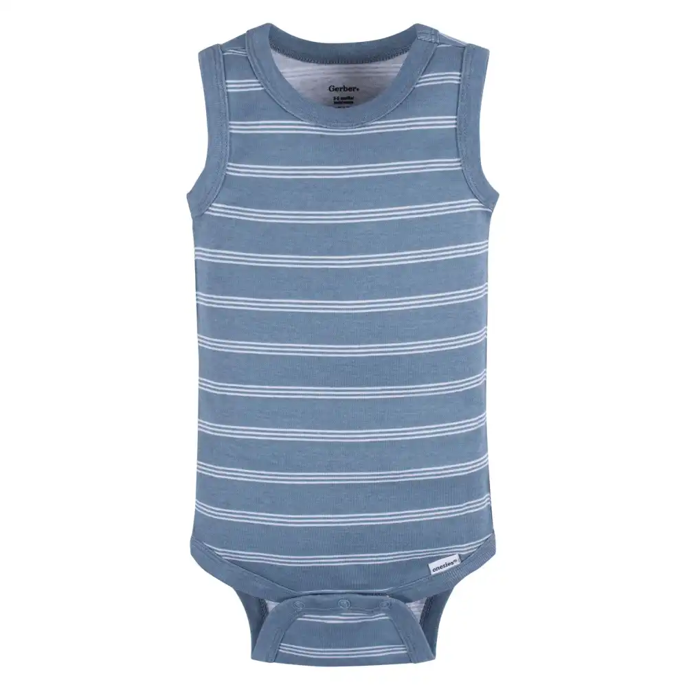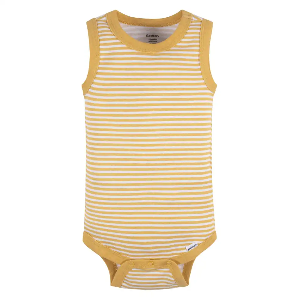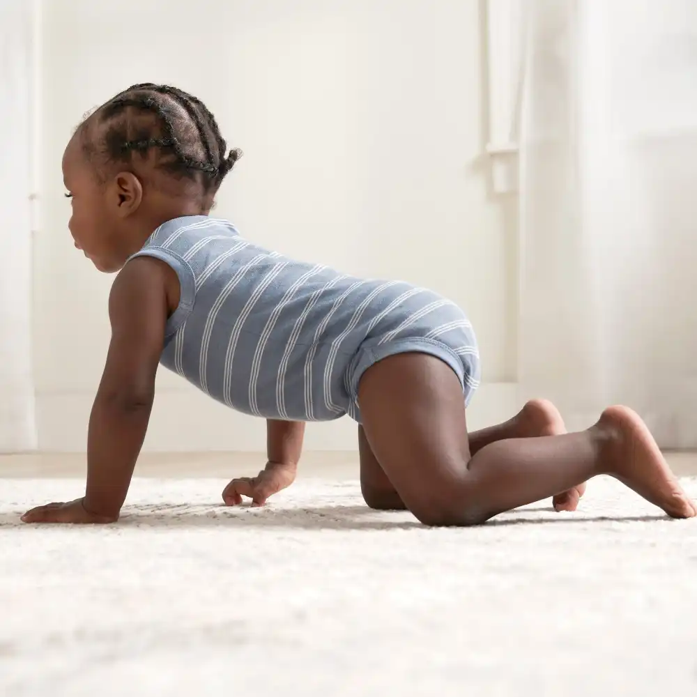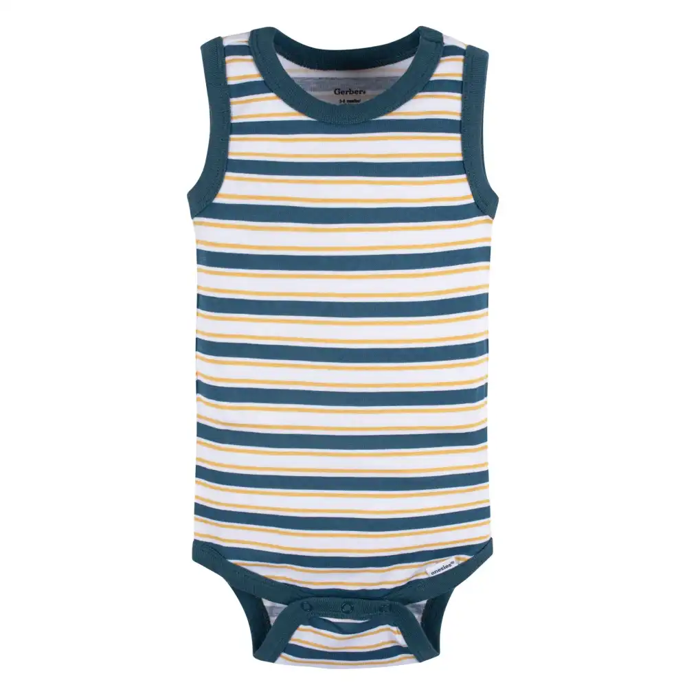 Onesies® brand bodysuits are a must-have for your baby's wardrobe. This pack of bodysuits comes in a range of blue, yellow, and gray colors with both solids and stripes, making them perfect for your baby boy. Made from 100% cotton, these baby bodysuits are soft, comfortable, and gentle on your baby's delicate skin. Thoughtfully designed with a snap closure for easy diaper changes and easy to care for, simply toss them in the washing machine and dryer for hassle-free cleaning. Our essentials have been independently certified with STANDARD 100 by OEKO-TEX® so that you don’t have to worry about harmful substances in your baby’s wardrobe. This pack includes five bodysuits.