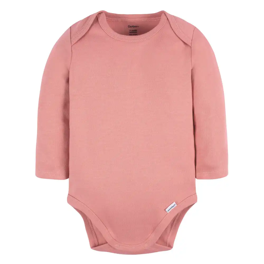 Keep your little girl cozy and cute in our pink long sleeve Onesies® brand bodysuit. Long sleeves are ideal for protection from sun and wind, and it's easy to add extra layers when needed. With a simple snap closure and convenient lap shoulder neckline, dressing and undressing is fast and simple. Made from 100% cotton interlock to be gentle on sensitive skin with a warmer feel than cotton rib and the perfect amount of stretch, your baby girl will be comfy all day long. Clean as needed with convenient machine washing and drying. Our essentials have been independently certified with STANDARD 100 by OEKO-TEX® so that you don’t have to worry about harmful substances in your baby’s wardrobe. This pack includes five bodysuits.