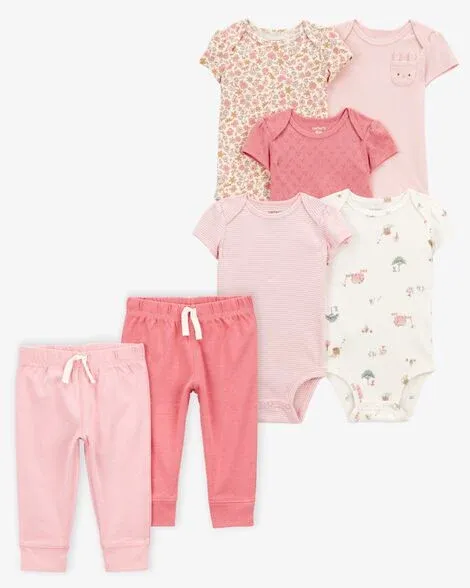 - 7-piece set includes 5 short-sleeve bodysuits & 2 pull-on pants