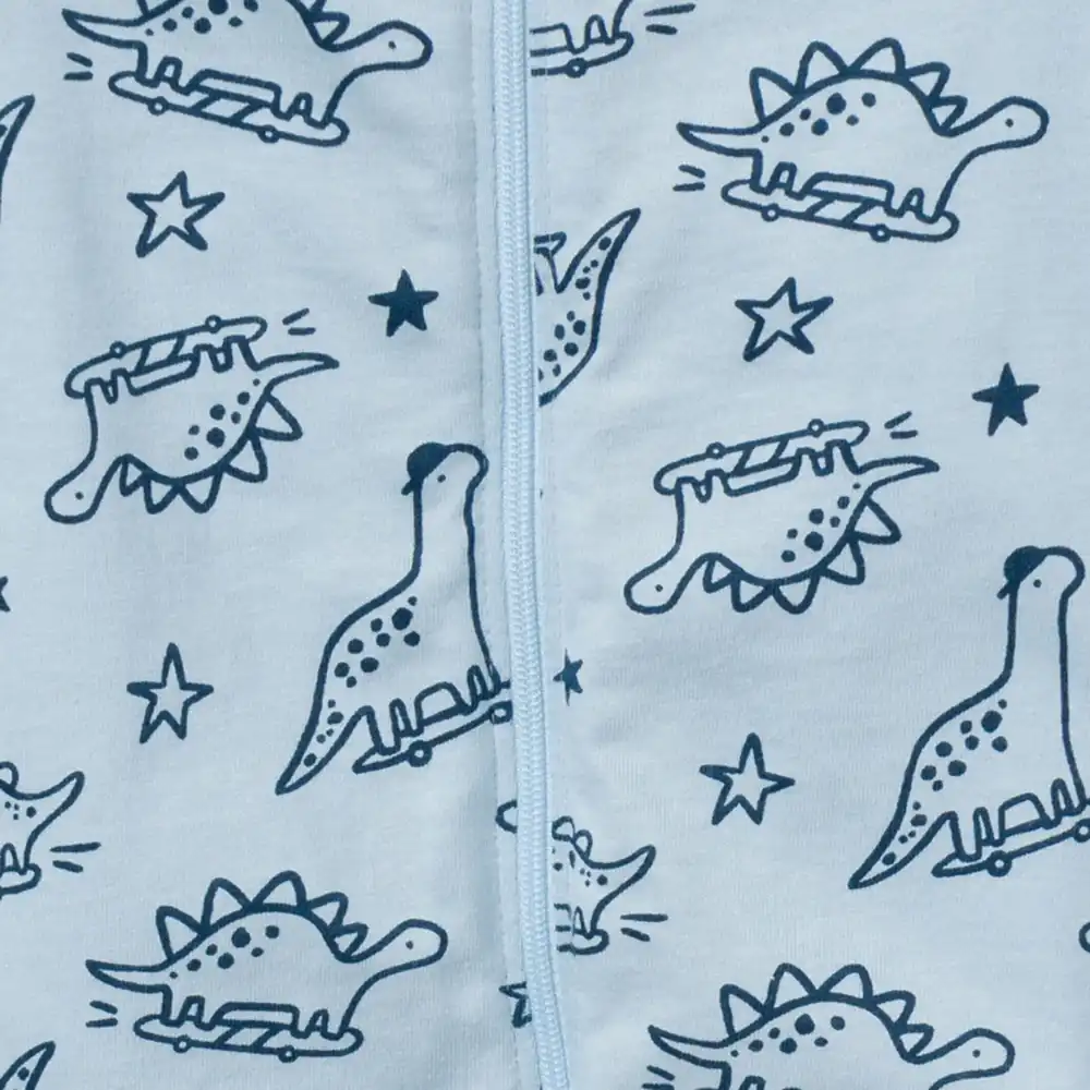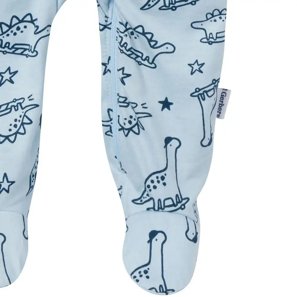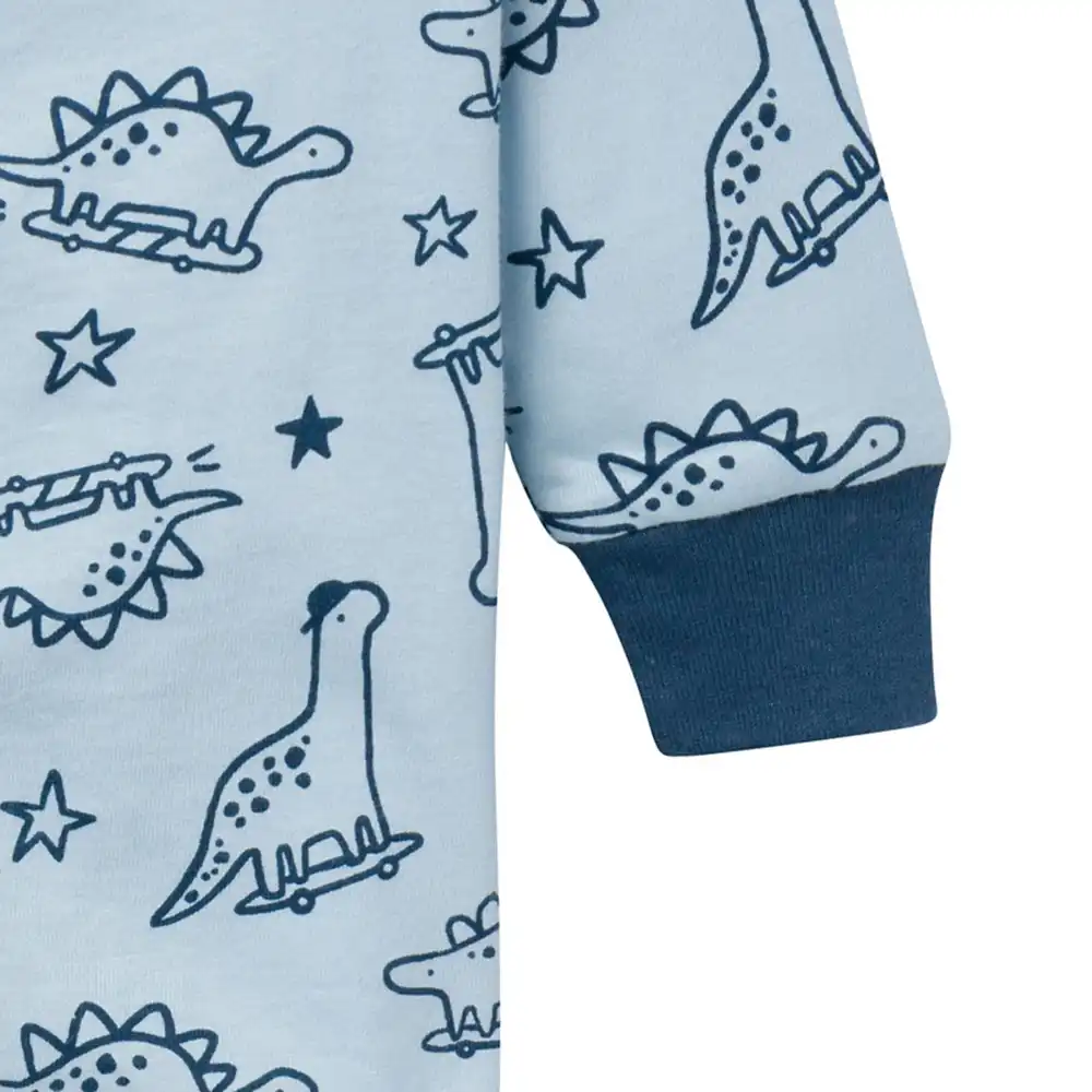 Our baby Sleep 'N Play is crafted from 100% cotton to be gentle on your little one's sensitive skin, whether it's naptime or playtime. This adorable blue footie features a fun pattern of dinosaur friends on skateboards for a playful and adorable touch. Designed for convenience and comfort, it includes a full-length zipper with a neckline protector, making dressing and diaper changes easy. The ribbed cuffs and neckline ensure a secure, comfy fit, while the footie style keeps tiny toes warm and cozy. This Sleep 'N Play is perfect for snuggling and a must-have for your baby's wardrobe. Our essentials have been independently certified with STANDARD 100 by OEKO-TEX® so that you don’t have to worry about harmful substances in your baby’s wardrobe. This pack includes 1 Sleep 'N Play.