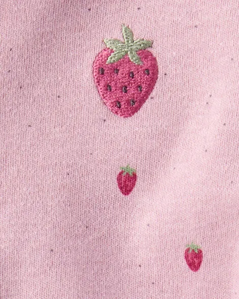 Covered in tiny strawberries and big on comfort, this 1-piece is all about easy changes and cozy nights. The built-in footies mean one less thing to keep track of. And the full-length zipper? A dream come true for middle-of-the-night wiggle fests. Bonus: a sweet embroidered strawberry at the chest for extra charm.